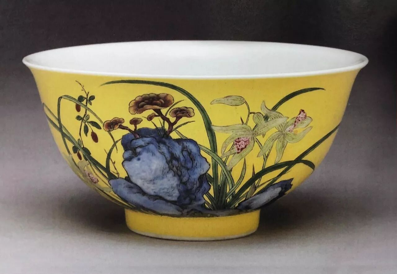 北京故宫藏清雍正淡黄地珐琅彩兰石纹碗,高5.2cm,口径10.3cm,足径4cm