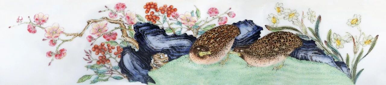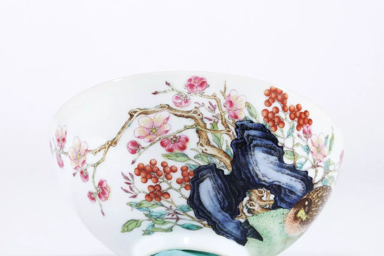 ►由于雍正的严谨和对艺术品的超高追求,促使愈来愈多的宫廷画家、烧瓷工匠纷纷参与其中,据造办处记载,当时有郎世宁、胡大友、贺金昆、宋三吉、戴恒、邹文玉、汤振基等宫廷画院画家为珐琅瓷胎绘画,瓷胎工匠有张琦、邝丽南,宋七格负责筛选彩料,邓八格指挥操作。在本季保利秋卖“瑰映如茵Ⅱ——玫茵堂暨欧美名藏盛清五朝御窑隽品”专场中,有一件清雍正玫茵堂典藏珐琅彩粉“平安春信”图碗,精湛的笔法工笔绘出梅花、洞石、鹌鹑,整图布局舒朗有致。珐琅彩瓷绘画应该是珐琅彩瓷的研究重点,从胎、彩和造型毕竟逃不过同时期其它彩瓷器的影子,而绘画却有它独特的一面。