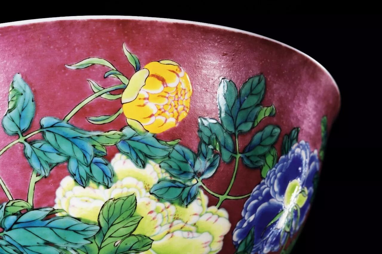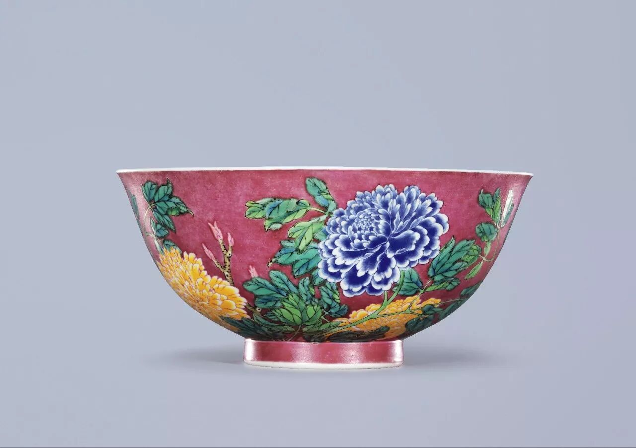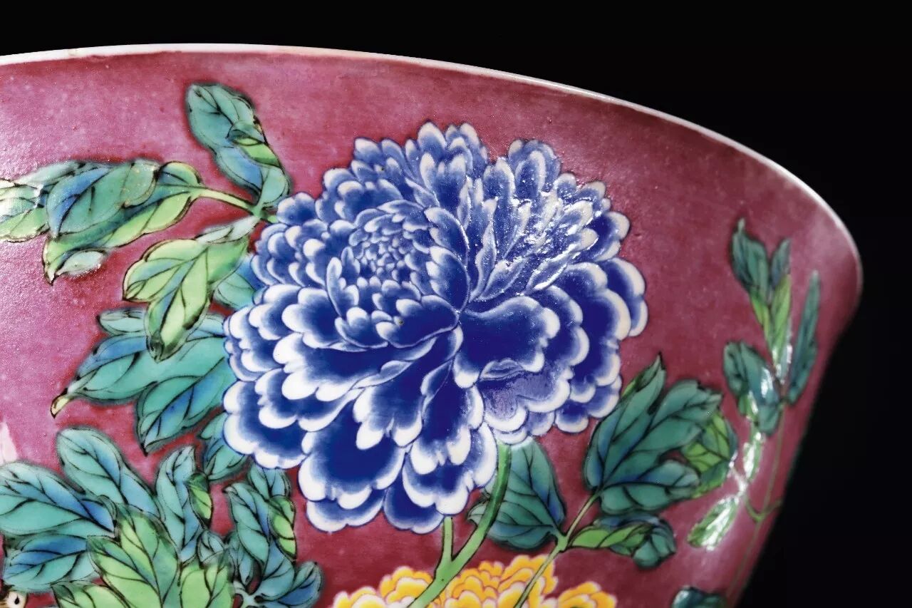 ► 该碗在胭脂紫地上再绘以九朵或盛放,或含苞的牡丹,俯仰有致,风姿绰约,布局繁密而有致,不减清疏之气,益见设计构图之佳妙,绘画之精妙颇有恽南田笔意,画匠以墨彩勾勒花枝叶脉,覆以各式彩料,斑斓绚丽,其中墨绿一色极为凝厚鲜亮,翠韵悠然。九朵牡丹计有鹅黄、嫩绿、宝石蓝三色,为典型的珐琅彩料,釉彩凝厚鲜亮,花叶部分再施以透明釉,故使得鲜润欲滴的牡丹花与直接施于涩胎不上透明釉的胭脂紫地子形成鲜明对比,一明一暗,一亮一涩。花蕊、花心以胭脂红点绘出粒粒细斑,刻画细致入微。花朵的描绘则以各色珐琅料勾勒轮廓,花瓣与轮廓线之间留白,一方面以彩料的熔融表现花瓣的轻柔,另一方面也尽量避免不同珐琅料彩之间因流动产生交迭。