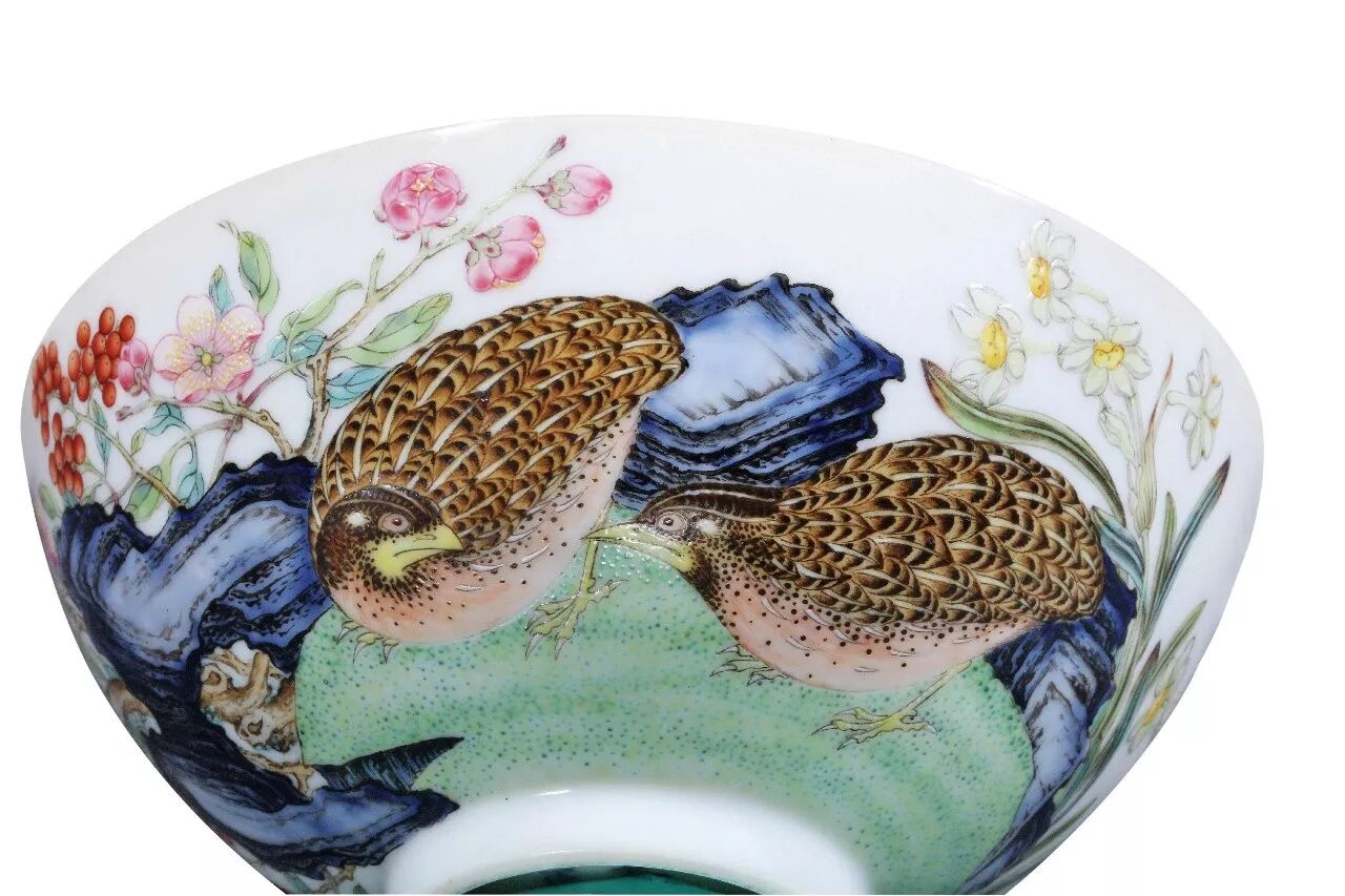 在中国传统文化中比较喜欢用动植物的谐音来表达吉祥寓意,因“鹌”与“安”谐音,鹌鹑从宋代就是祥瑞的象征。在清代,鹌鹑依旧是喜闻乐见的吉祥图案,在经历了九子夺嫡,雍正对于「平安」、「祥瑞」的吉祥安慰,可能高过清代任何一位帝王。这件“平安春信”图碗也许正是雍正对“安定”的祈愿。
