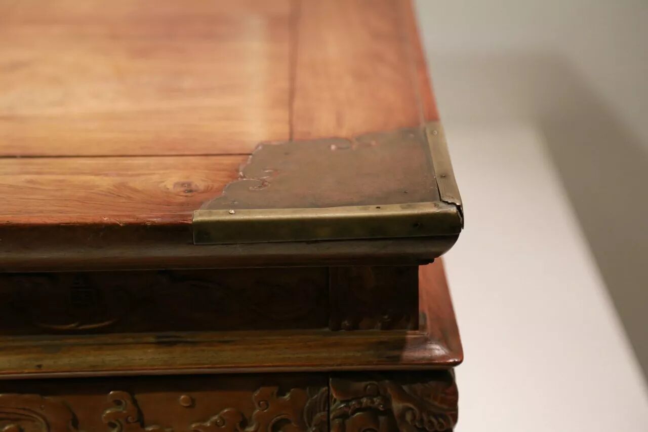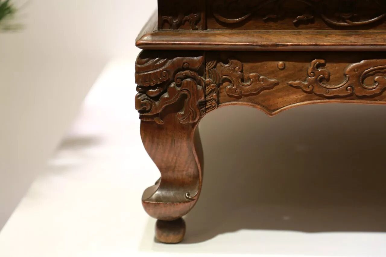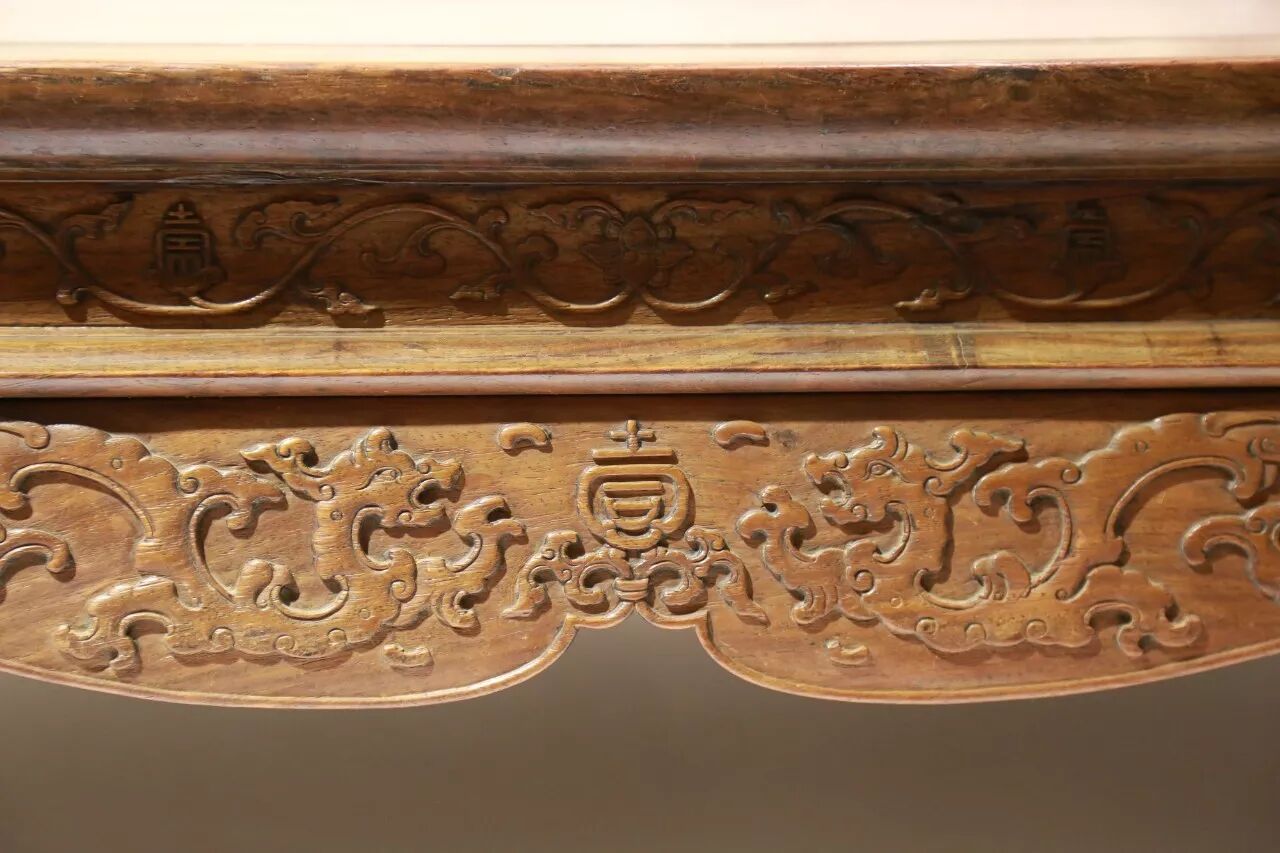 ▌高束腰结构,长而宽的束腰装入边抹底面、托腮及腿足上截的槽口内,束腰四面雕刻缠枝莲纹,正面分布四枚寿字纹,两侧则各两枚。托腮肥厚,中起剑脊棱线脚,束腰、托腮、边抹之间以穿销加固。牙板削出些许弧度,正面壸门牙板宽大流畅,曲线富有张力,其上雕刻双龙捧寿纹,龙尾及四足均变成卷草,卷转圆婉,富有韵律。