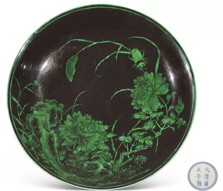 清雍正 墨地绿彩花卉草虫纹盘一对