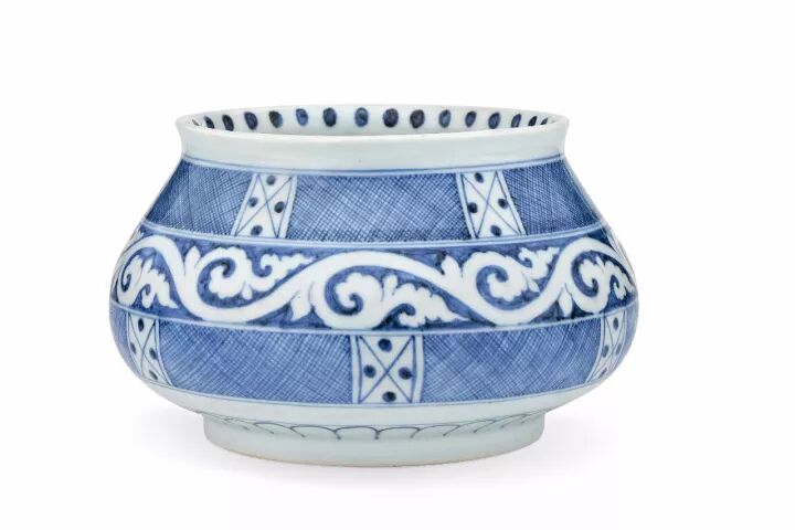 本场中最为亮眼的是一件明宣德青花卷草网格纹鱼篓尊,不仅品种稀少,且为典型的明永宣御窑仿伊斯兰风格瓷器,尤为珍罕的是,本品不仅器型仿自域外,装饰图案也带有浓郁的伊斯兰风情。