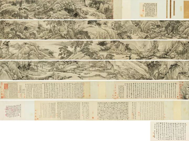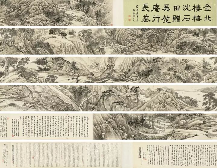 此卷长逾十米,明时即为太仓王世贞所藏,著录于《弇州四部稿》,据卷尾王世贞题跋,此卷沈周历时三年方完成,“无一笔不自古人,而以胸中一派天机发之”,堪为石田翁“第一笔”。此卷自王世贞后,万历年间归常熟文靖公严讷之子严道普收藏,崇祯间归睢州袁枢,有清一代经梁清标、王顼龄、许乃普、盛昱等诸公递藏。民国时金城又将沈周此卷并其后明贤题跋临摹一卷,即《摹沈石田赠吴匏庵山水行书》,因缘际会,此季沈周与金城两卷将共同呈现于“大观”夜场。