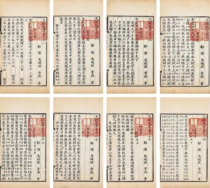▌古籍善本、碑帖法书等门类的众多拍品,涵盖元明故籍、明镌版画、民国精刻、明季善拓、商周金石、西文善本等各类精品。古籍善本中以明嘉靖三年(1524)司礼监刻本《文献通考》为最。是书钤明内府“广运之宝”、“表章经史之宝”,卷首载明世宗《御制重刊文献通考序》、马端临《自序》等,凡三百四十八卷。白棉纸精印,抚印极精,装帧整饬,煌煌一百巨册,为明代中期内府刻书白眉。