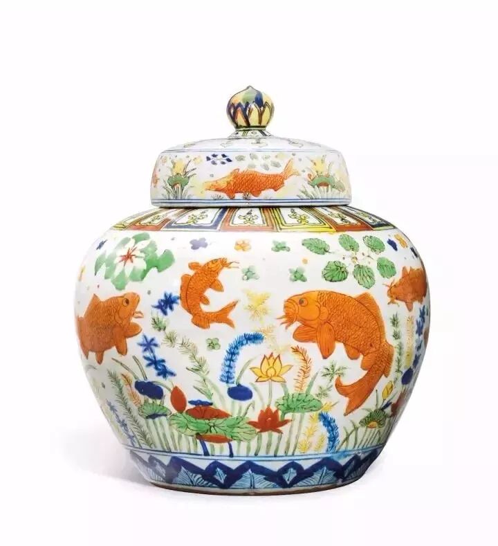 明嘉靖五彩鱼藻纹盖罐六字楷书款
