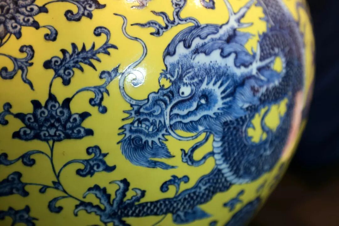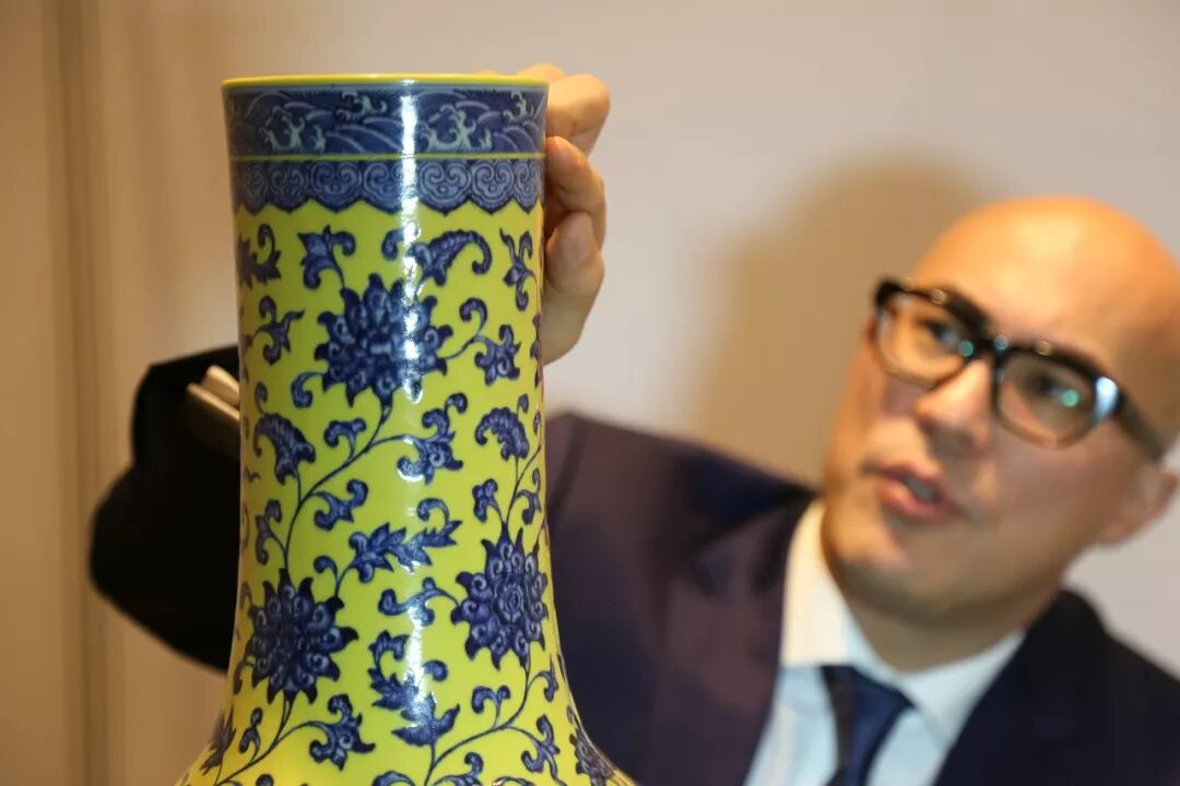 我自己也是相当的怀疑当我只是看图片的时候,所以我去了瑞士去看这件拍品。当我看到它的那一刻,它很明显是真的-那个非常浅的蓝绿色,颜色并没有在这里出现,那是黄底花瓶一种非常经典的风格,几乎察觉不到那种颜色的色调。非常有意思的一点是这里的一个小错误,你可以看到这个画家把龙的一只眼睛涂上颜料了-我从没见过这样的情况,像是一个胎记!这个画家应该是打瞌睡了,下午的时候!但是它的品相真的很好,非常崭新。