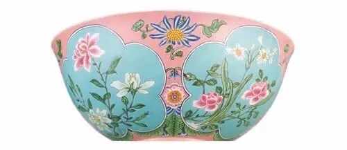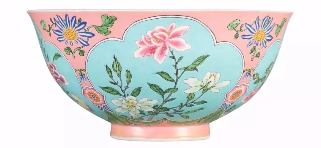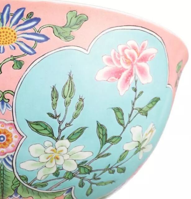 清康熙粉红地珐琅彩开光花卉盌(局部)