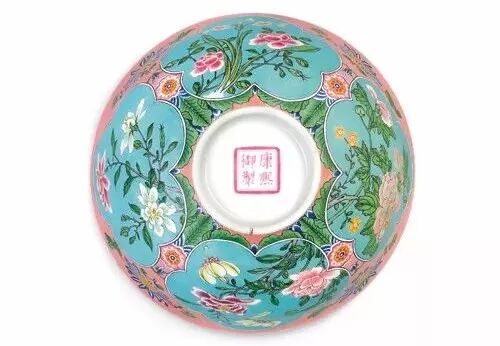 清康熙粉红地珐琅彩开光花卉盌