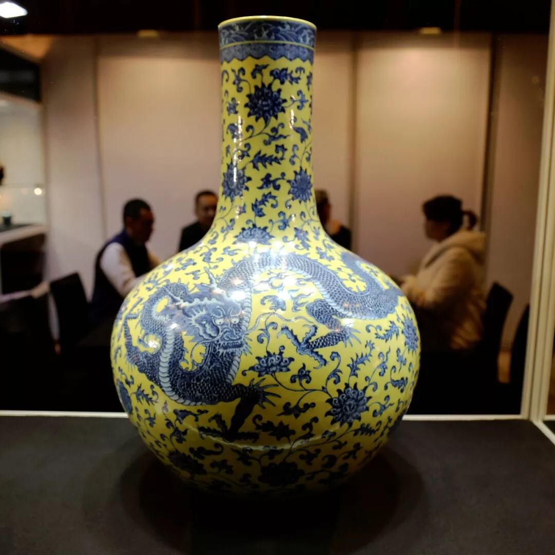 这就是那件花瓶,这种造型天球瓶,是15世纪早期非常经典的造型。当然在市场中几乎没有这种造型的花瓶在流通,它是复兴于雍正和乾隆时期。这是最大的类型,只有一个大家都知道的是我们在2004年卖出的,也是有两条龙-这种模型你会发现不同种类的装饰,一条龙,9条龙等等。2条龙的花瓶通常都会有点大-我不太确定是不是有什么特别的原因或者目的。你可以看这里的标记-我记得当这件拍品出现在日内瓦的时候,创造了特别高的价格,那里有许多关于它的讨论-基于照片,大多数人认为这样尺寸的拍品,如此明亮和平常的构图。。。你看这种类型的黄底色是不常见的,通常颜色都是青花。。。所以许多人当时非常怀疑,他们没有见过它。