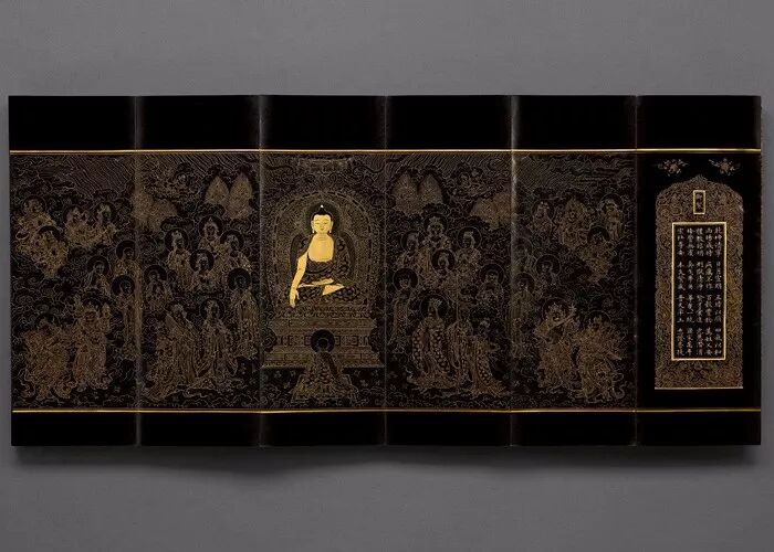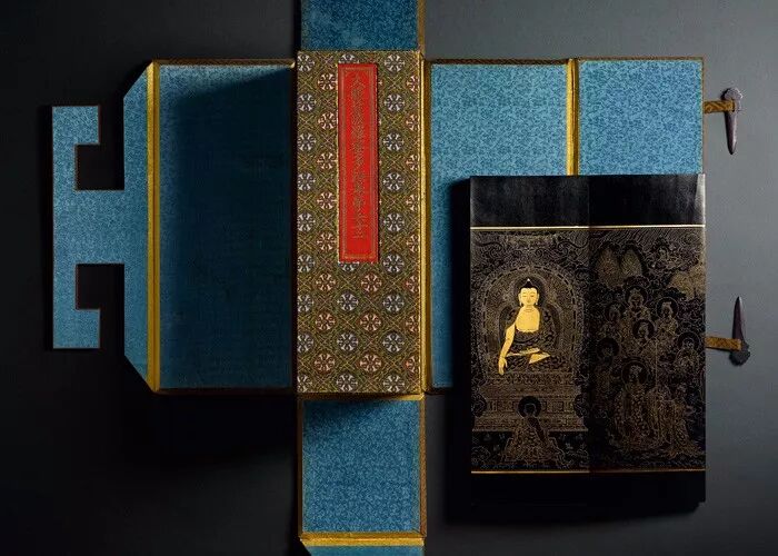他被任命为皇帝抄写4本佛经-这是一种表达祝福的方式。整个的制作是非常耗时的。宣德时期是个黄金时代,明朝的黄金时期,是整个朝代的顶峰。在艺术上有着极高的创造力,为了生产出最精美的艺术品花费了许多资源。这是其中的一卷,这是第一卷,你可以看到锦缎,镀金。如果你看博物馆中的佛经,除了这个佛经(还有两套在故宫和台北),没有其他的像它一样,令人惊叹的品相和质量。前面这里你会看到一个对国家的祈祷文,这里有两个字符-熟悉清朝艺术品的人会认出这些字符,代表帝王的诏令。在明代发现这两个字符是极其罕见的。你可以从纸上看到难以置信的非常漂亮的光泽,就像是漆一样。这是羊脑,这个纸是用羊脑镀膜覆盖,使它有恢复力-比如,昆虫不能蚕食这些纸。这个时期的书籍是不好保存的,比如大多数书籍都被虫蛀,但是这个覆盖膜保护纸张,你可以感受一下它,就像是漆器一样。这里你可以看到一些设计,如果你看这个佛像,你可以看到它是首先雕刻的,几乎雕刻的,然后再用金墨填进去的。