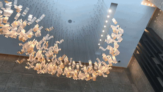 深圳中心One Palace T7 塔尖环幕公寓大堂《百鸟归巢》吊灯,由捷克知名艺术装置定制公司Lasivt选用199片手工吹制玻璃设计而成,寓意百鸟归巢、万事圆满,成为T7璀璨夺目的明珠。