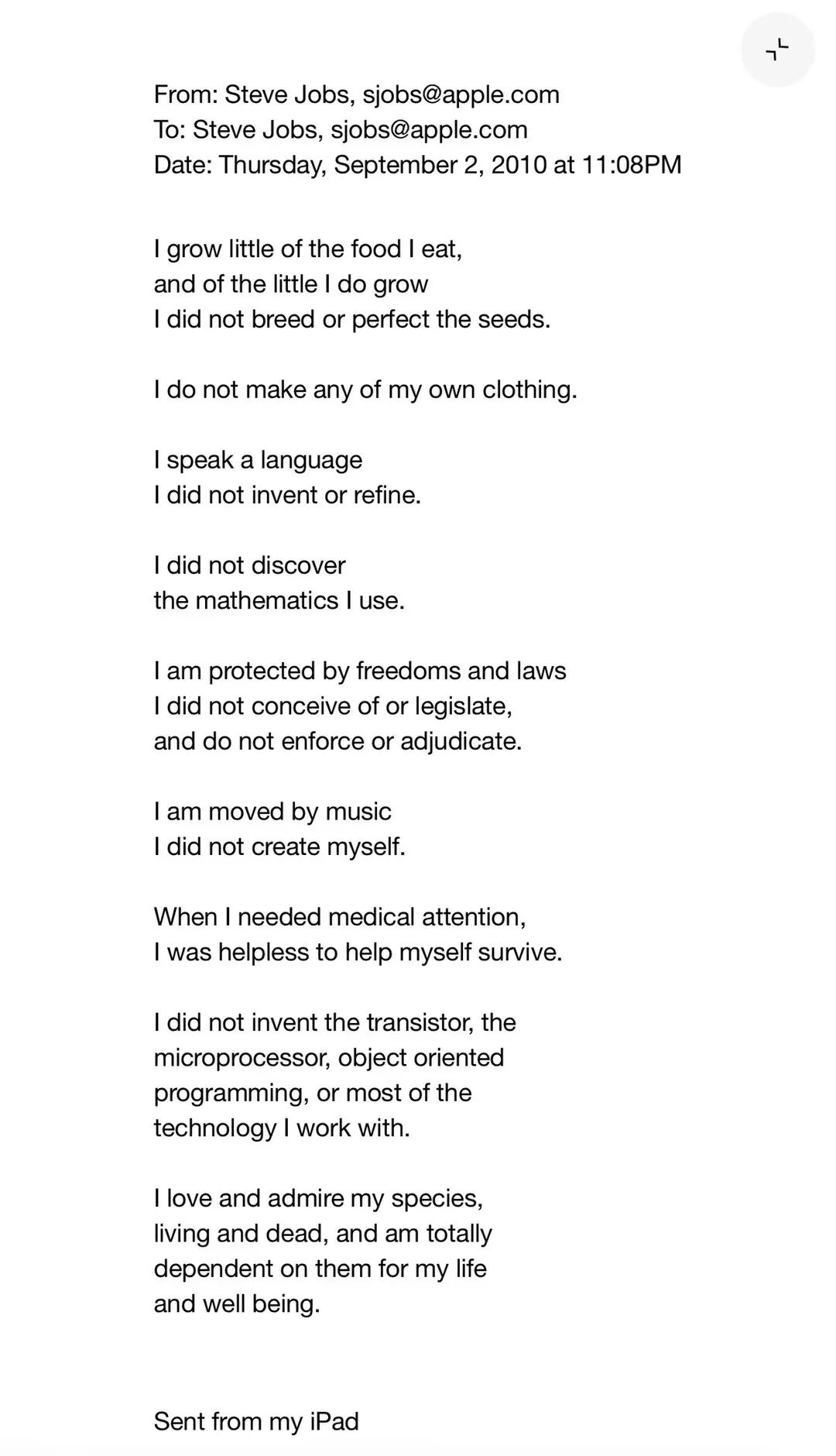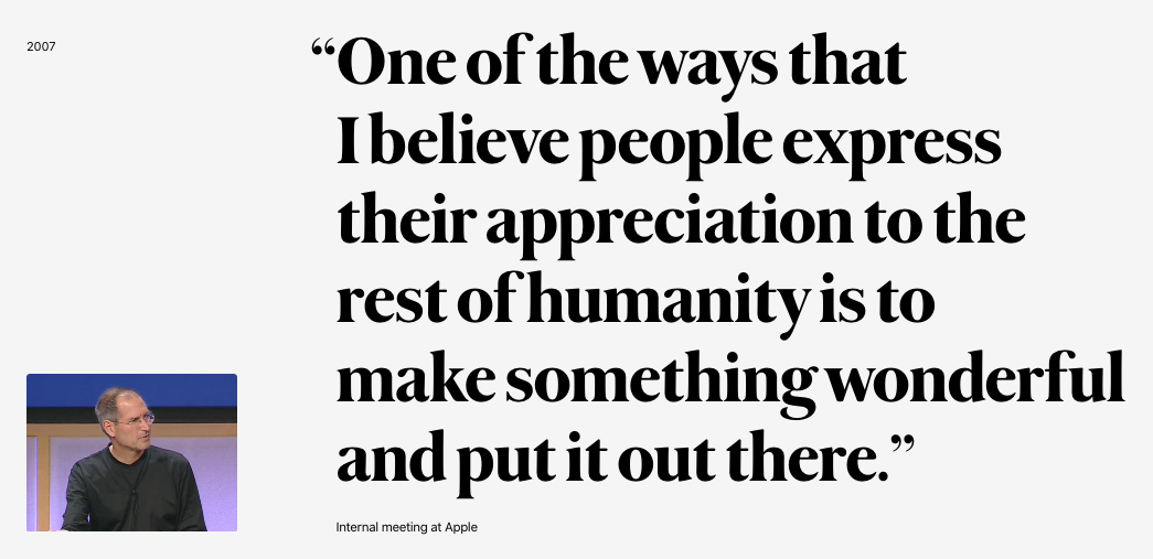 “我想大多数创造者都想为我们得以利用前人取得的成就表达感激。我并没有发明我用的语言或数学。我的食物基本都不是我自己做的,衣服更是一件都没做过。我所做的每一件事都有赖于我们人类的其他成员,以及他们的贡献和成就。我们很多人都想回馈社会,在这股洪流中再添上一笔。”——《乔布斯传》