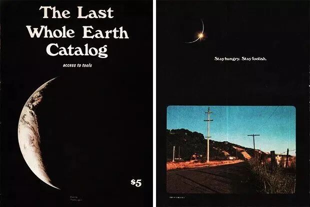 “当我年轻时,有一本很棒的刊物叫《全球型录》(编注:Whole Earth Catalogue,也译《地球概览》),是我们那一代人的的圣经。它的创办人叫斯图尔特·布兰德(Stewart Brand),他就住在离这不远的门洛公园,他的诗意与才气创造了这份刊物。那是在1960年代末期,个人计算机和桌面排版还没出现,排版全靠打字机、剪刀和宝丽来相机。这份刊物像是纸上的google,却比google早了三十五年:它怀有理想主义地介绍了大量实用工具和一流观念……他们出版的最后一期是在1970年代中期,那时我像你们现在这么大,那期的封底照片是一张清晨的乡间公路,是喜欢乘车冒险的人常会见到的风景,照片下是一行字:Stay hungry. Stay foolish。这成为他们停刊的告别语。也是我一直以来的期许。”