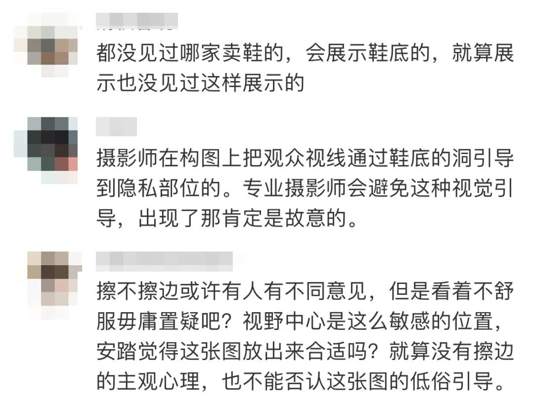网友称,海报里,模特将鞋底对准镜头,镜头角度微微上扬,鞋底缝隙正对女性大腿根部。“学过设计的都知道什么叫排版视觉中心点,这张图什么意思不言而喻。”
