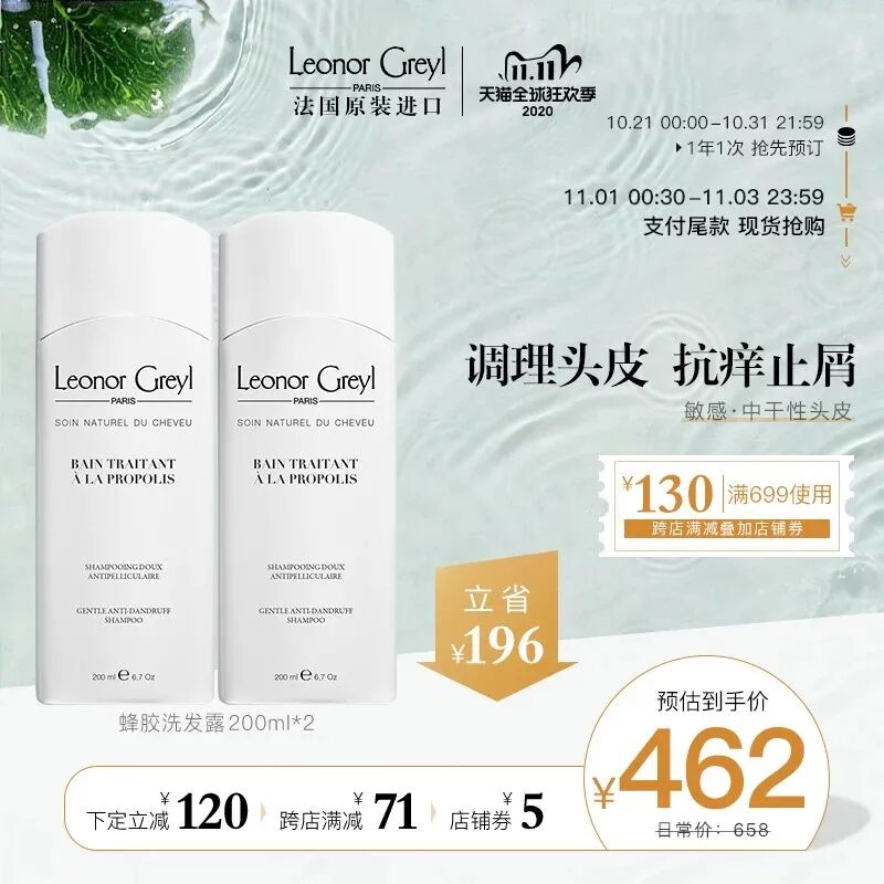 Joyce产后有轻微的脱发困扰,看到安利后有认真做功课,Leonor Greyl其实是法国天然洗护品牌来的,萃取槐花蜂蜜,能养护毛囊,对改善掉发很有效果;而且洗完后,头发整个就是干净清爽有蓬松,完全就是理想中洗发水的样子~不过呢,这款洗发水不容易起泡,爱丰盈泡沫的妹子们会失望,此外,价格也很辣手,原价差不多300多元1瓶(200ml),但我们群的妹子,强烈建议直接买最厉害的1L装,管饱1年。原价738元/200ml*2,双11价462元/200ml*2(可使用店铺券,参与跨店满减)