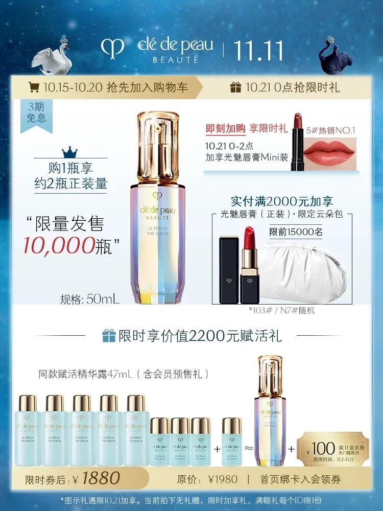 这款是水前精华嘛,用在洁面后第一步,能快速唤醒肌底细胞,令后续护肤品的吸收力提升至2倍以上,后续用任何其他护肤品,都赚到了好吗?!用了一周左右,Fandy最明显的感受是,肌肤完完全全润亮了起来,变得通透有光泽,就是那种“好皮肤”既视感。更重要的是,能感觉到肌肤在一点一点变得更稳定。查了下,它包含多元三色海藻精粹、日本珍珠精华等等,能在促进大量年轻健康表皮细胞生长的前提下,让肌肤变得健康、透亮起来。说它应该是人手一瓶的水前精华,也不带夸张der这段时间皮肤有变好,还归功于Fandy在同步用CPB光采三件套,如果你想入抗初老必备的日夜分时护肤套装,请仔细往下看~Fandy因为最近泛油严重,用的是清爽型水乳套装(还有湿润型可以选),一般在超导镭射瓶之后,就用精华水,同样是流动性好又清透的肤感,同样包含“亮肌赋活精粹”,还有双重玻尿酸成分,上脸有种“润物细无声”的安心感。日夜乳则完全满足了护肤爱好者的诉求(如果你一直看我们的帖子,肯定知道,我们一直建议早晚用不同的护肤品,应对不同环境压力),日乳主打抗氧化,能抵御光老化伤害,复原抗氧化的能力;夜乳主打夜间修复,促进黑色素代谢,自然能形成良性循环,一起令肌肤变得匀透润亮。总之,如果你有一定预算,试试看CPB家口碑满满的超导镭射瓶和光采水乳,会一下子觉得“果然是好东西”。趁着双11买,当然更划算!讲真,今年应该是CPB家有史以来优惠力度最疯狂的一年,我们做功课的时候,都惊呆了。简单来说,10.21提前付定买超导镭射瓶,买30ml享54ml,相当于买一送4/5正装量(限量6000份!),优惠力度太大了,看楼下这张表,会更一目了然。- 10.21付定,购30ml享54ml,四舍五入,买一享二!限量6000份!- 10.21 0-2点付定金,额外加赠CPB光魅唇膏mini装- 预定2件且实付满1200元,加赠限定胸针+光采宠肤礼- 预定实付满2000元,加赠限定云朵包+光魅唇膏正装总之,现在点击楼下淘口令,先加购起来准没错。下单的时候,向客服报暗号【WoW姐】,还会再多送CPB日乳5ml+夜乳5ml,疯不疯狂?不仅如此,除了超导镭射瓶之外,光采水乳优惠力度也很疯狂,几乎都是买正装送1/2正装量,很少见的折扣了。