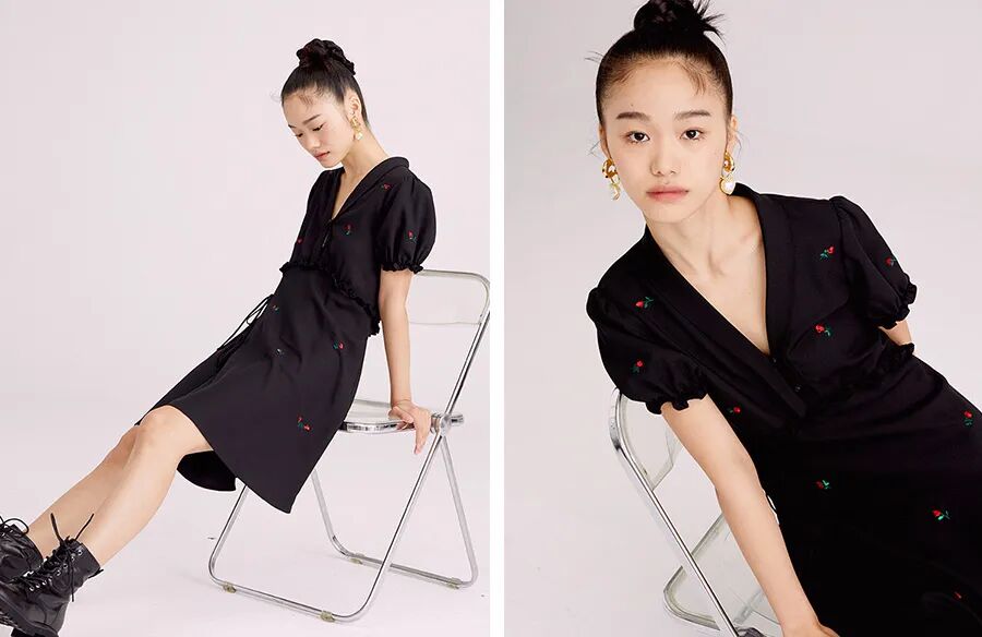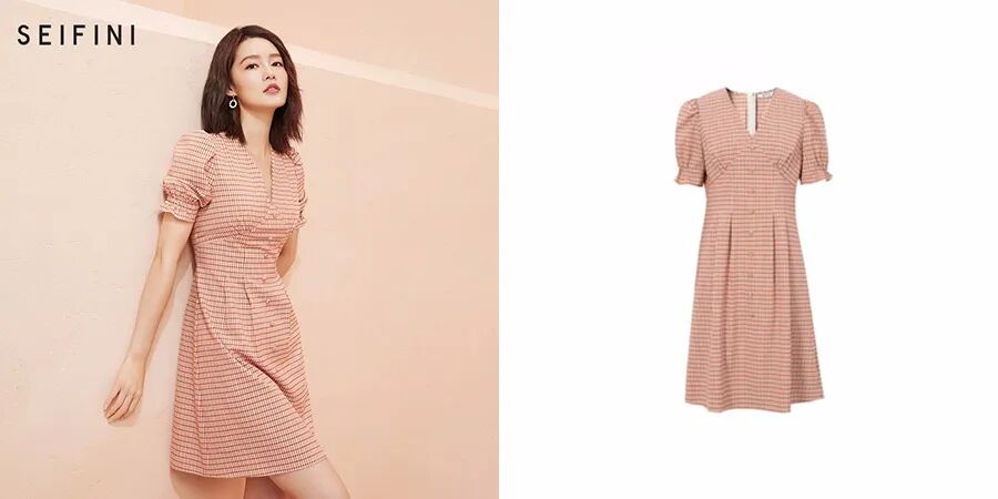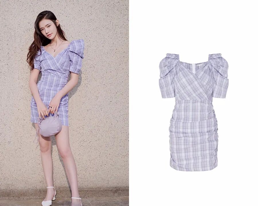 方领对微胖er很友好,不过肩宽背厚的姑娘们要慎选泡泡袖,小胸妹子则要特别考虑胸前有褶皱处理的连衣裙。同理,V领/圆领+泡泡袖设计连衣裙都很火,女团小姐姐们都爱它。