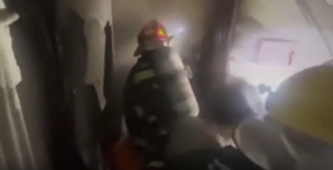 到达现场后,南京消防立即组织水枪手铺设水带上楼,并安排破拆小组破拆防盗门。屋内浓烟弥漫,能见度低,三个房间中,一个房间房门紧闭,呼救声不断从此房间传出,消防员第一时间进入,将男主人救出。