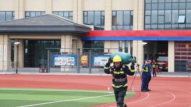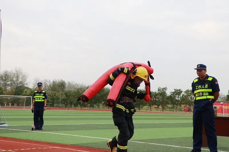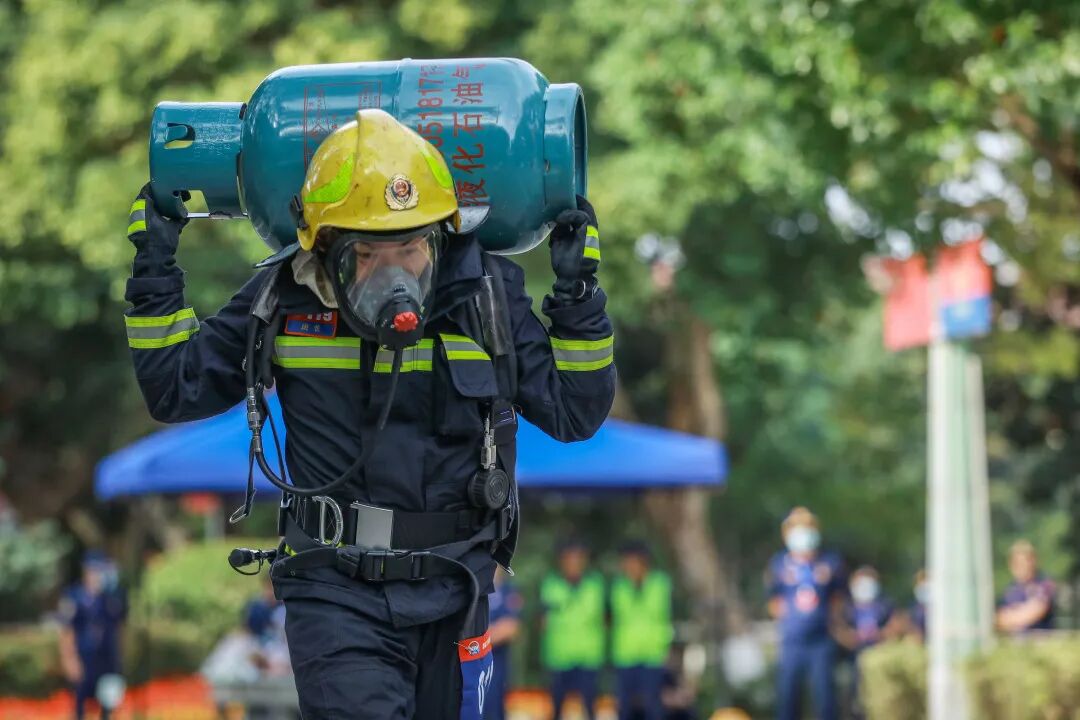 模拟烟热复杂区域,参赛人员多次往返,依次转运假人、液化气钢瓶、泡沫桶至100m疏散区,并更换空气呼吸器气瓶通过烟道,拼的就是耐力。