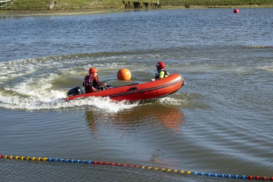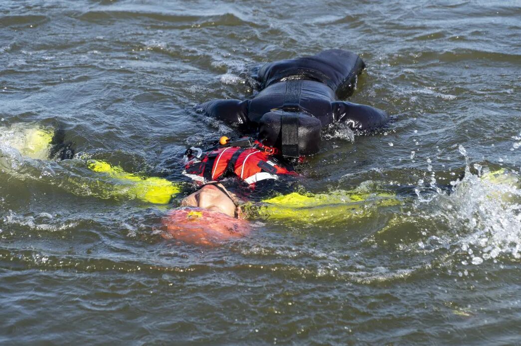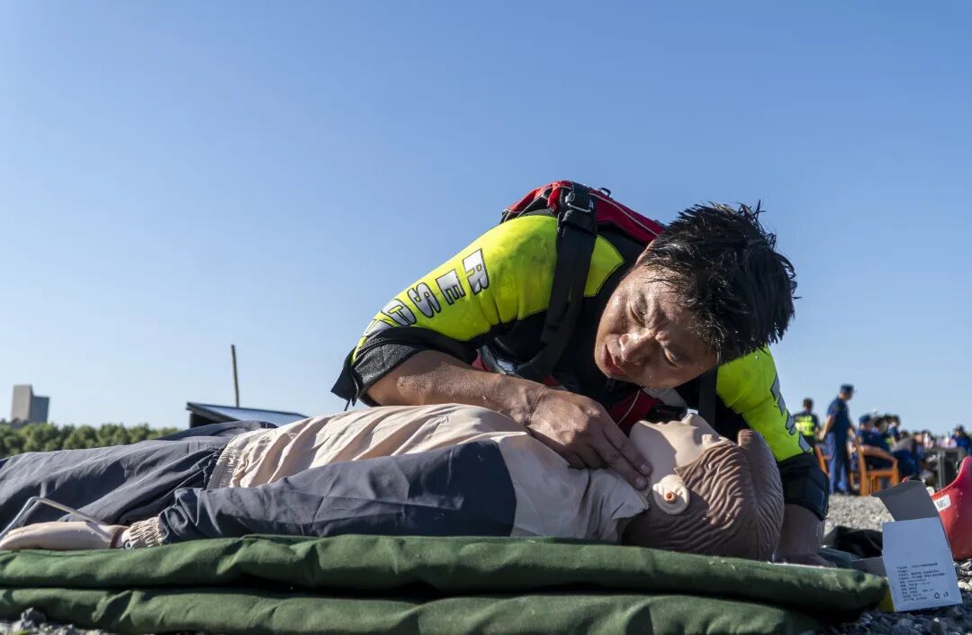 模拟人员溺水,参赛人员以最快速度入水游至救援艇,绕过所有浮球后,拖带假人至岸边,对急救模拟人实施岸上急救操作,检验队员身体极限下的救援能力。
