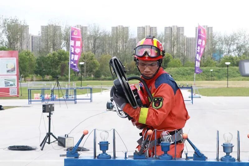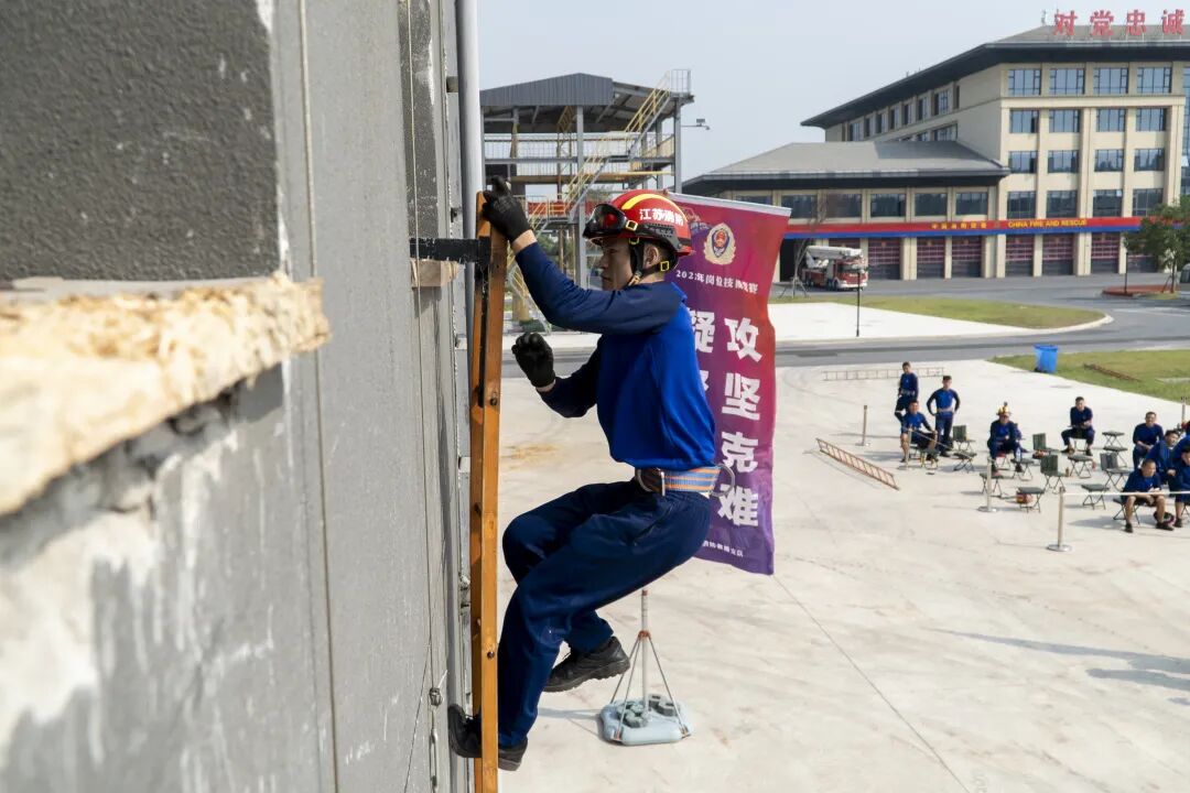 参赛人员手脚并用沿麻绳攀爬至四楼,在利用8字环悬垂下降,启动无齿锯,在灯泡上切割5根铁丝,最后操作液压扩张器,转移5个瓶子,并用液压扩张器将5个乒乓球放在瓶口上,既要快、又要准。