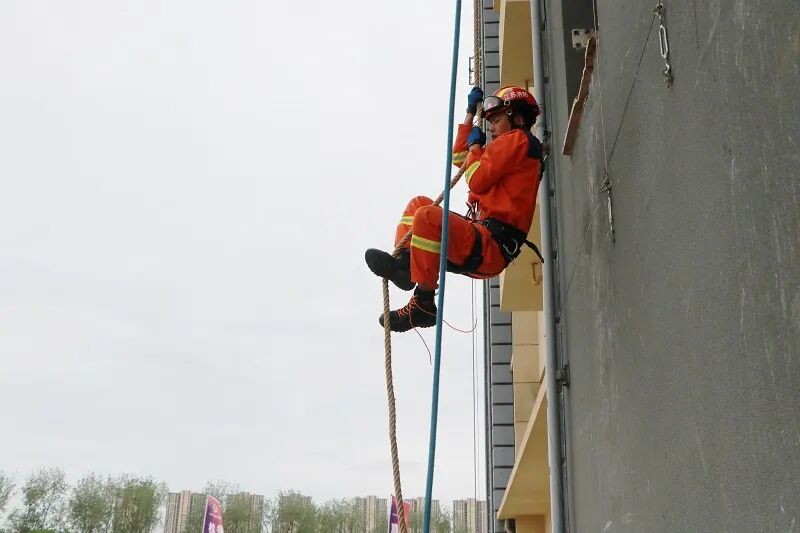 模拟人员被困绳上,参赛人员依次运用单人速攀上升技术上攀、过结和一对一救援技术将被救者救至地面,考验队员救援真本领。