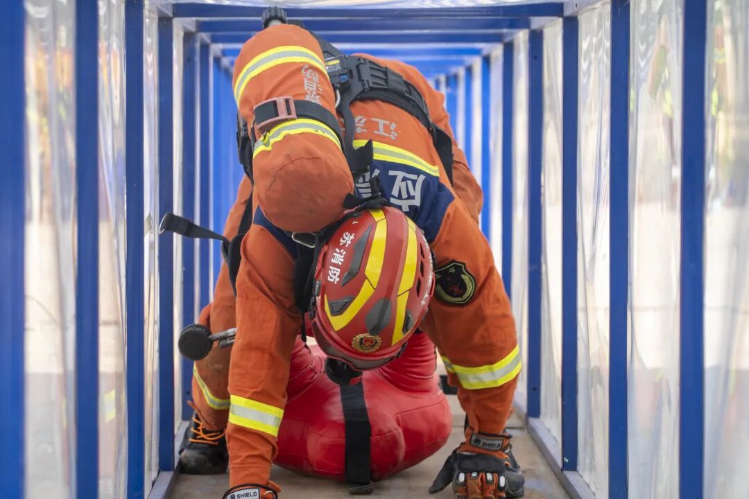 模拟人员被困,参赛人员依次破拆防盗门、混凝土模块、圆木后,快速佩戴空气呼吸器,利用扁带拖带假人至安全区域,磨炼队员快速救援能力。