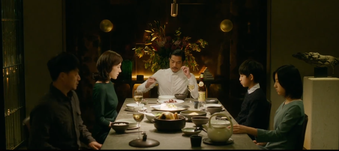 那是最后一场重头戏,一家人围坐在巨大的餐桌上吃饭,其他人你来我往互相博弈、揭秘,荣梓杉就只有聆听,但他尝试对每个演员的台词进行判断,进而做一些本能的肢体反应,例如喝口水,吃个菜,或者眼神不经意地瞥向对方。