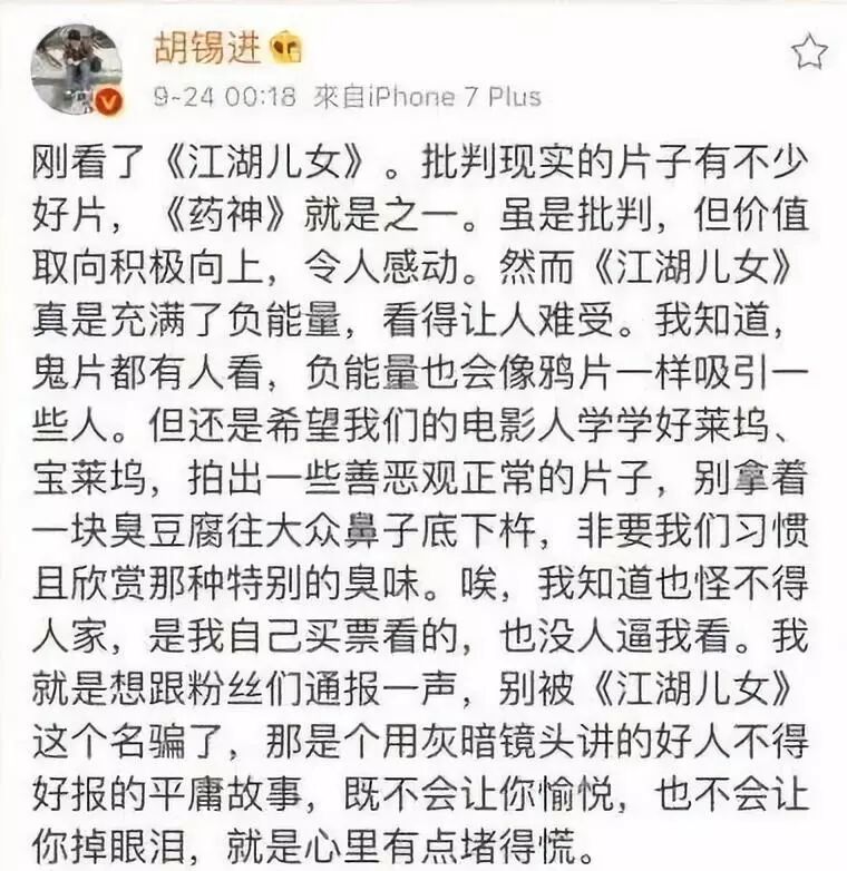 这是非常莫名其妙的评价,换我是贾樟柯我也受不了。我可以接受你不喜欢我的故事,但你没道理用价值观和所谓的善恶观一棒子压死我。