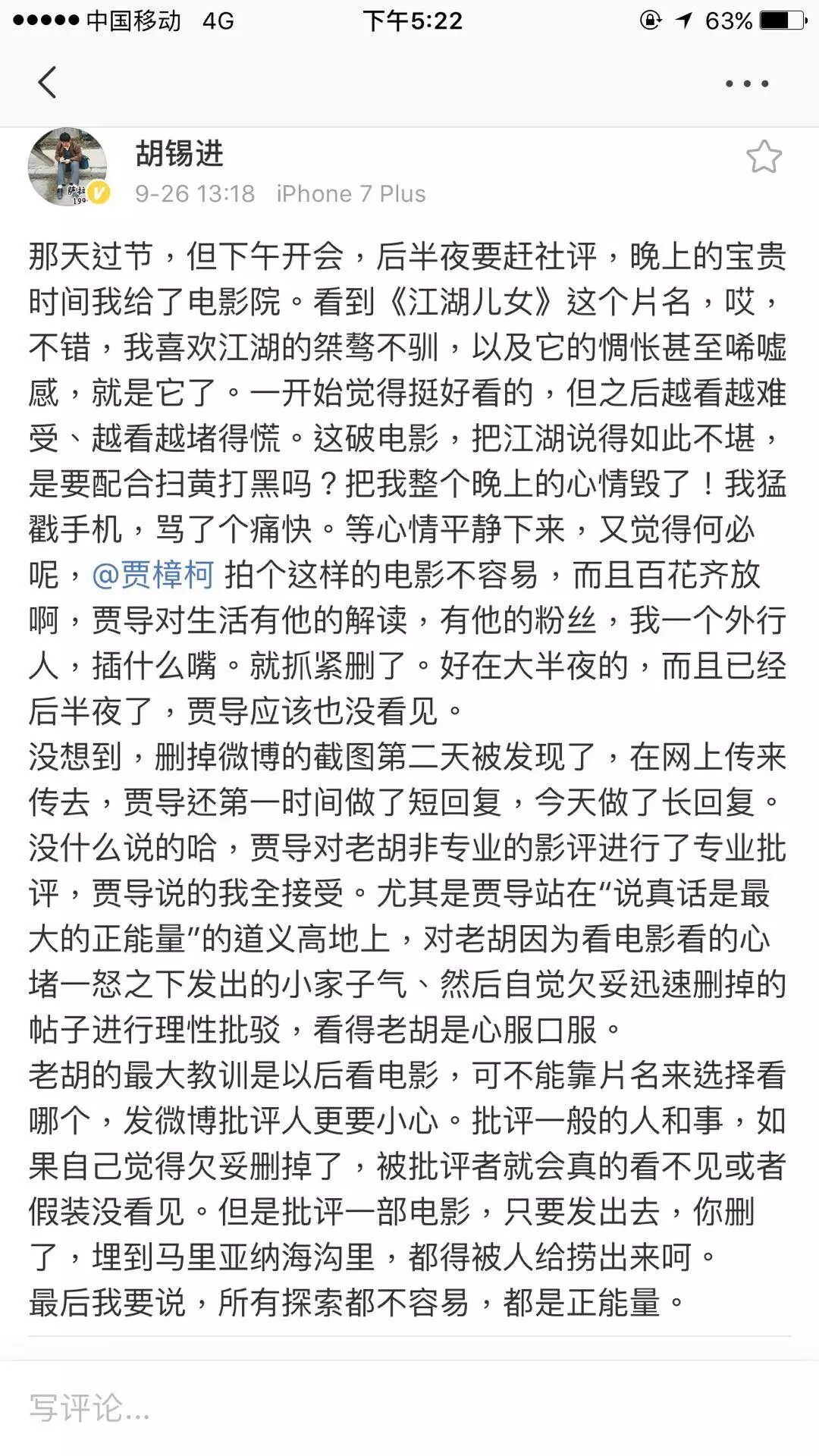 通篇在解释自己为什么删博,把箭往贾樟柯抓牢他【及时删掉的微博截图】,【大张旗鼓地回复】上射,意指人家接受不了批评。