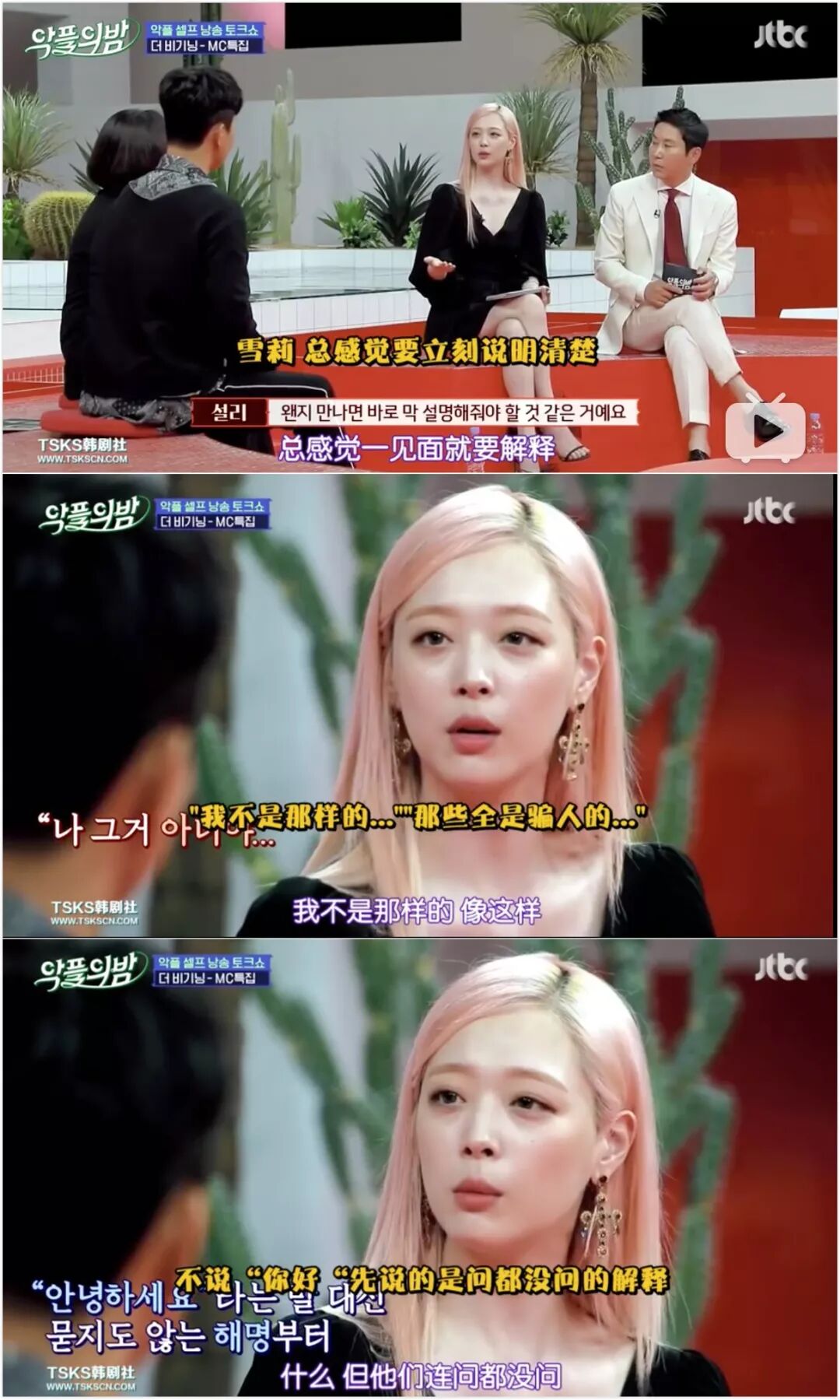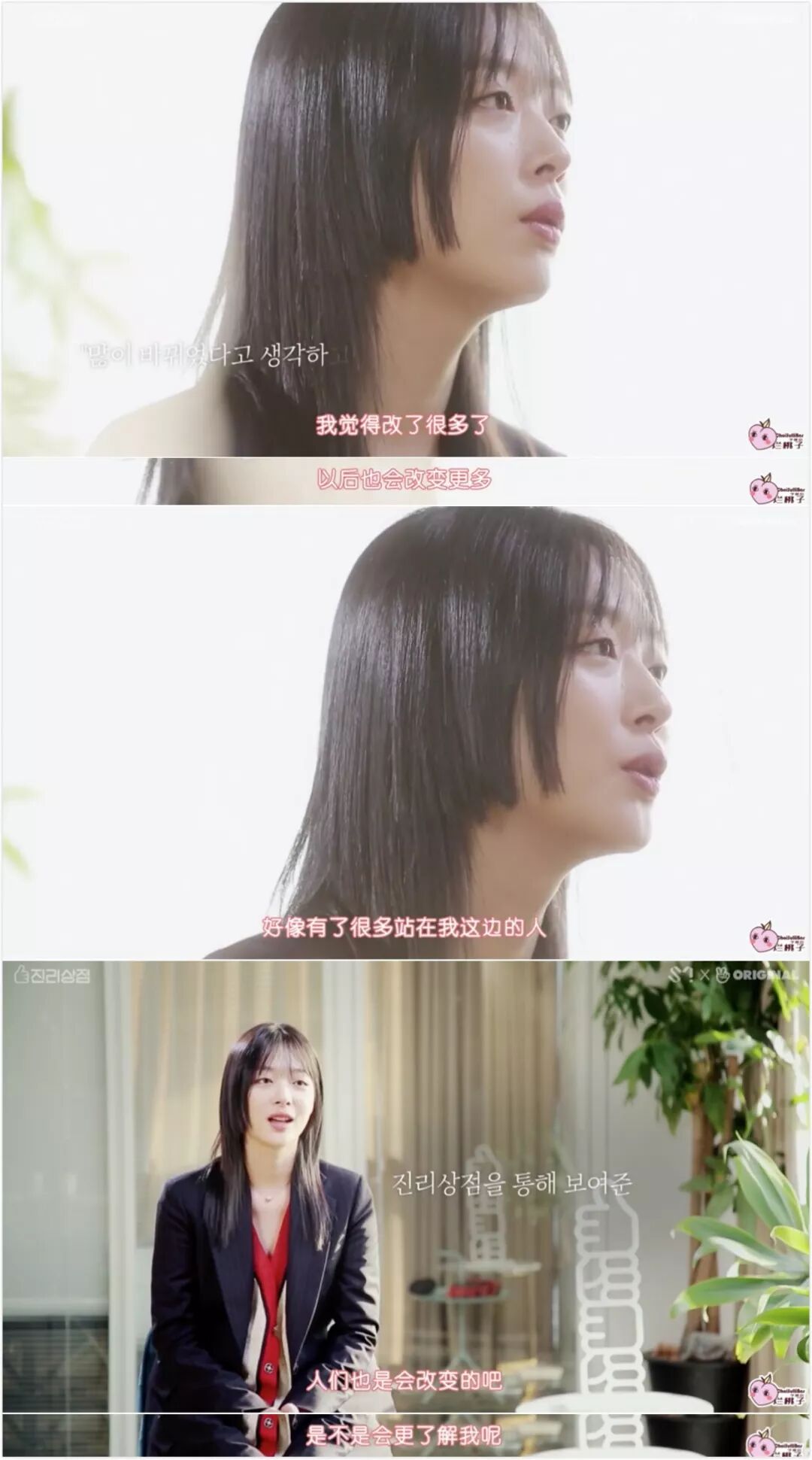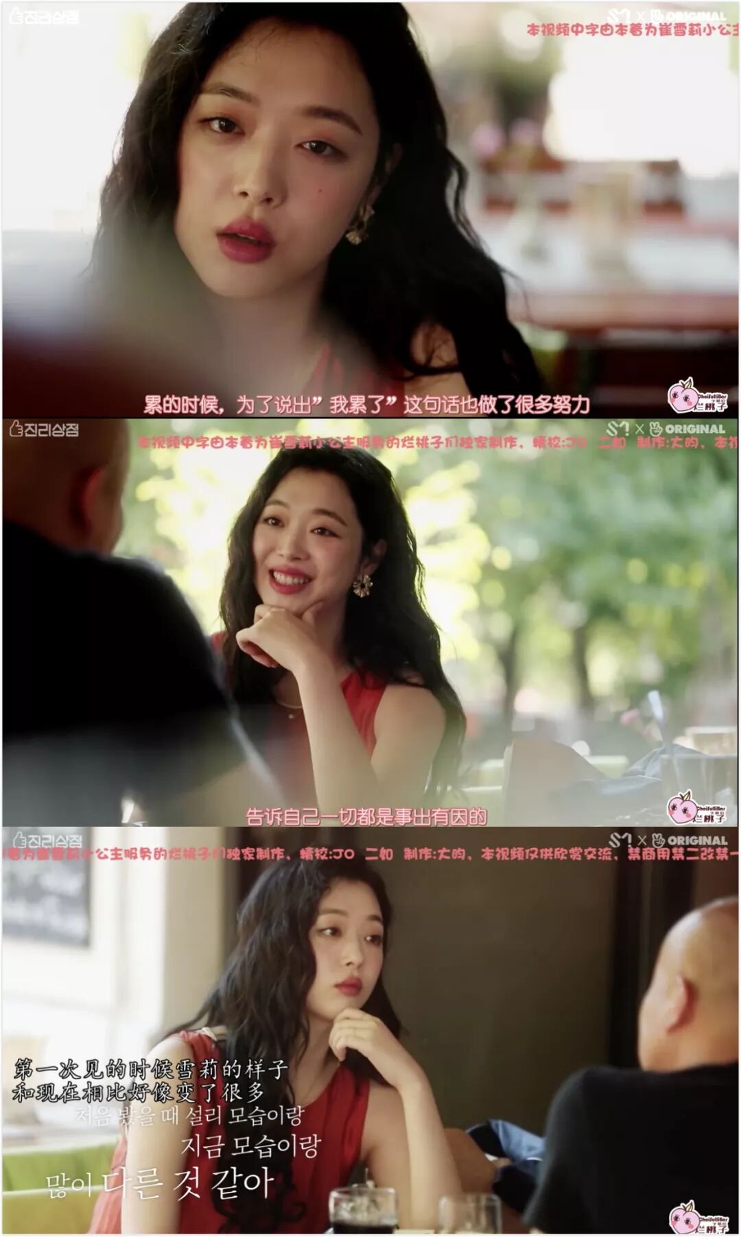 2018年年末她开始了自己的首档真人秀《真理商社》,算是正式意义上的回归娱乐圈。她的努力正是学会示弱,把那个堵住的自己再次敞开,愿意对朋友说一句“我累了”。关于这三个字的艰难,如果有看我们推荐过的《浪漫的体质》应该明白▼▼▼因为想拍出雪莉最自然真实的想法,《真理商社》没有编剧,是档逻辑挺乱的节目。她在柏林的游玩和在韩国的私生活不断穿插进主线,导致我看了三期才看懂主线也就是商社到底什么意思:以崔雪莉的名义和不同品牌进行合作,出带有她个人特色的特别款产品,开快闪店售卖。这个节目框架对于她的挑战就是踏出家门,和不同的人见面,而通过那些陌生人的眼睛还原一个崔真理。她永远笑眯眯的,几乎每句话都带点哈哈哈的尾音,同僚一开始以为她是做戏,后来发现这人就是这么和和气气▼▼▼逛柏林并不便宜的小店,把所有女性工作人员叫进去让她们选耳环,“我请客”▼▼▼直男以为她是被捏造出的毫无性格的爱豆,“见面之后才知道她只是一个美丽的地球人”▼▼▼节目公开了她放自己画作的IG账户、画满随笔画的本子,是少女小心翼翼的想象力▼▼▼《真理商社》绝对不算好看的综艺节目,正如崔雪莉的二哥所说,她是个无趣的人。即使挖到反差这么大的取向,也因为她太“理所应当”所以“没什么好深挖下去了”。一开始的柏林,她聊完上一次崩溃就乐观展望“好像会遇到一个握住我的手的人”▼▼▼我根据时间推,大概是她发出这次聚会照片引起的事端,在国内也有讨论▼▼▼她略带哽咽地说起大众对她的有色眼镜,你们应该都有看到这张截图▼▼▼但事实上,她只难过了几句,便再次乐观起来——《真理商社》播出后已经好了很多了。“好像有了很多站在我这边的人,人们是会改变的吧,是不是会更了解我呢?”▼▼▼《真理商社》留下了崔真理最后一段努力生活的纪录,她对解释有欲望,对未来有盼头,对朋友有依赖,对外界有信任。因此她在末尾才会说:记者朋友们请疼爱我一下吧,观众朋友们请疼爱我一下吧。但等到2019年6月,她发表个人单曲,常驻综艺《恶评之夜》(类似于《瓣嘴》),态度就已经变了。“就,认可我这种人的存在吧。说实话不会觉得看着我很有趣吗?”▼▼▼雪莉在《恶评之夜》上读那些恶评再反击的样子,和她在直播中小声念叨“我不是坏人”之间差距的是一道塑料泡沫搭出来的围墙,她的内里就是个敏感多疑的小女孩,需要鼓励和爱意,远没有那么多的girlpower去挥洒。其他MC问她,在被这么严重攻击的情况下,为什么还要坚持?她说就是想告诉大家“这没想象得那么严重”,话很好听,但绝不是她那个状态下能撑得起的标语。雪莉一度展示过脆弱,这是她自我疗愈的一个环节。粉丝都知道她的迷茫,对她说的话无非是一句“做你想做的事情吧”▼▼▼但时隔一年当她坐在摄影棚里,为了解释自己没有吸毒飒爽地说着“我就在法律范围内自由”时,自由已经变味,脆弱还是被收起来了▼▼▼自昨天她去世后,前任崔子的SNS就被大量攻击,包括微博也有不少骂他的言论。认为是他带坏了这颗人间水蜜桃,雪莉的腐烂就从他的《吃做睡》开始,没有他也没有现在的悲剧,等等等等▼▼▼当年两人在一起后就没对外回应过恋情细节,爱豆和地下rapper,14岁的年龄差,每一条都让人浮想联翩▼▼▼崔子所处的是饶舌团体DynamicDuo,爆出绯闻之后他便几乎不在综艺上出现。另一位成员Gaeko单独上《无限挑战》的时候还被嫌弃:为什么来的不是崔子?▼▼▼