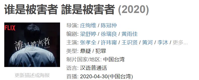 今年网飞还有一部全新制作的台剧《谁是被害者》,张孝全、许玮宁领衔主演,林心如特别出演,剧本改编自本土作家天地无限的悬疑推理小说《第四名被害者》▼▼▼