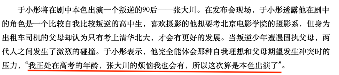 一改之前的说法,综艺学习#不是演戏和学习#两不误,但要把学习放得重一点,上节目也说自己要考北电▼▼▼高考前不久,于小彤接了新戏《劝和小组》,“本色出演”叛逆高考生▼▼▼最后,北影中戏这些专业院校的门都没摸到,百度介绍停留在了▼▼▼拍戏,意味着赚钱,他做演员,有很大一个原因是觉得,这个工作比其他行业赚钱▼▼▼在《我家那小子》里他说,没戏演怎么赚钱呢?他跑去卖酒,把胃喝坏了。在他看来,男人最重要的是外表光鲜,还必须有个好车。在这样的内外夹击下,当初颇有灵气的小宝玉越走越平庸▼▼▼也就碰上非常丰满的、爆发力强的角色,才能有些发挥▼▼▼身高是高,但头太小,小到很容易看不清楚本来就小的五官,不协调▼▼▼于是,很长一段时间里,于小彤带着姐弟恋的标签成为了综艺咖,代表作只有海陆和陈小纭两位女友。诸多不顺叠加之下,上综艺时,他的情商低脾气差成为了一个热搜点,很讨骂,更是流失了观众缘。《演员请就位》,他接的是陈凯歌的原创剧本《红尘》,不满自己台词少,一番【彤言彤语】又被群嘲。他死轴、犟脾气,自以为是地说“演戏这事我没服过谁”,观众各种骂他心里没点数▼▼▼看上去自负,但实力跟不上,又拉不下脸承认隐藏在肌底里的自卑。录节目那阵是9月,那个时候,于小彤已经近1年没戏拍了,期间只客串出演了辣目洋子的喜剧片《生活对我下手了2》。一个有着大好开局的年轻人,长期处于低谷、接不到好戏、总是当配,让他对自己有了不少怀疑。他觉得自己演技一般,因为不自信拒绝了《演员》节目组两次,每一期比赛都觉得自己会被淘汰,时常否定自己▼▼▼