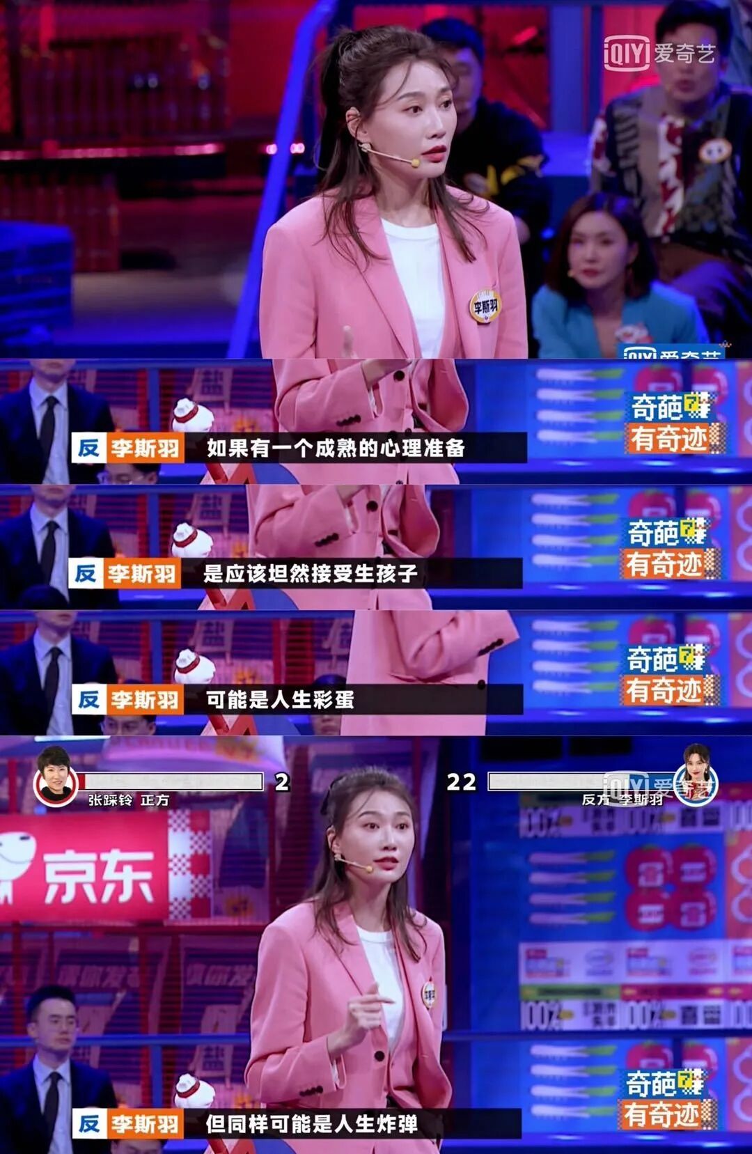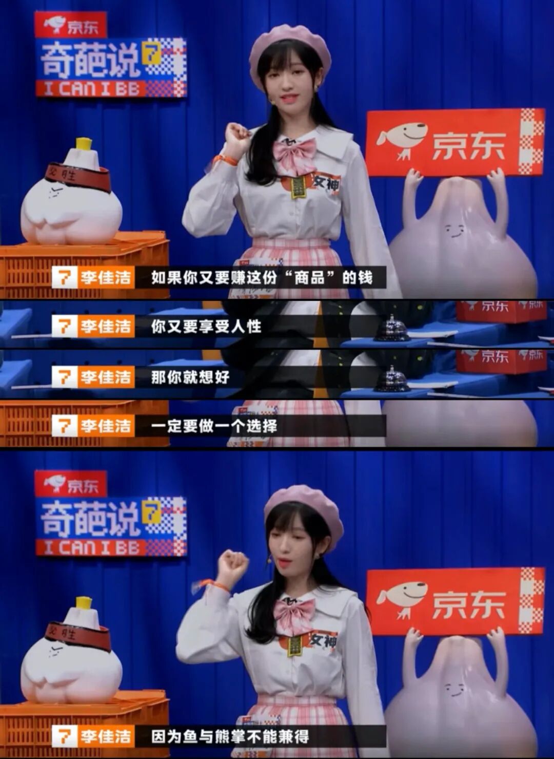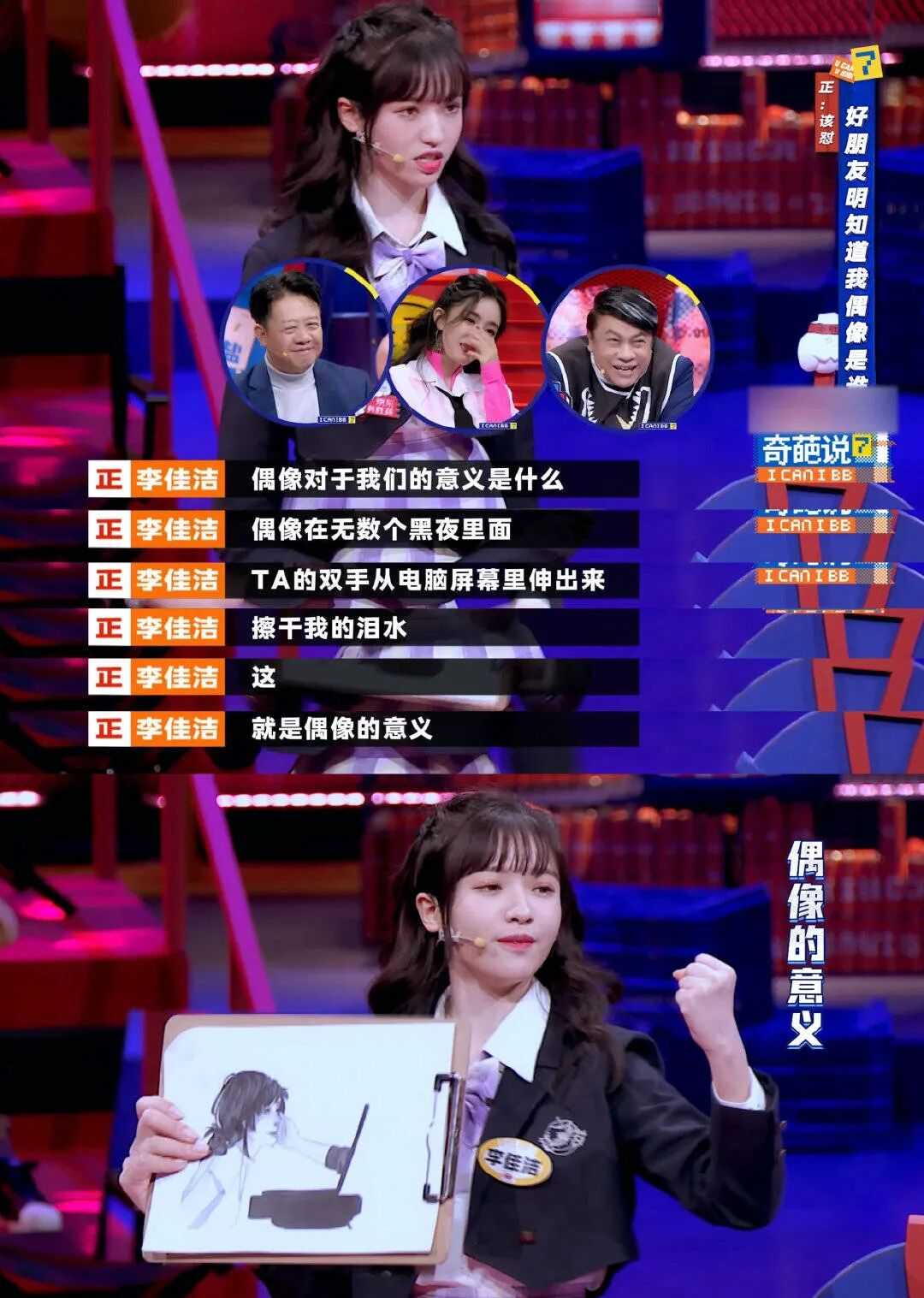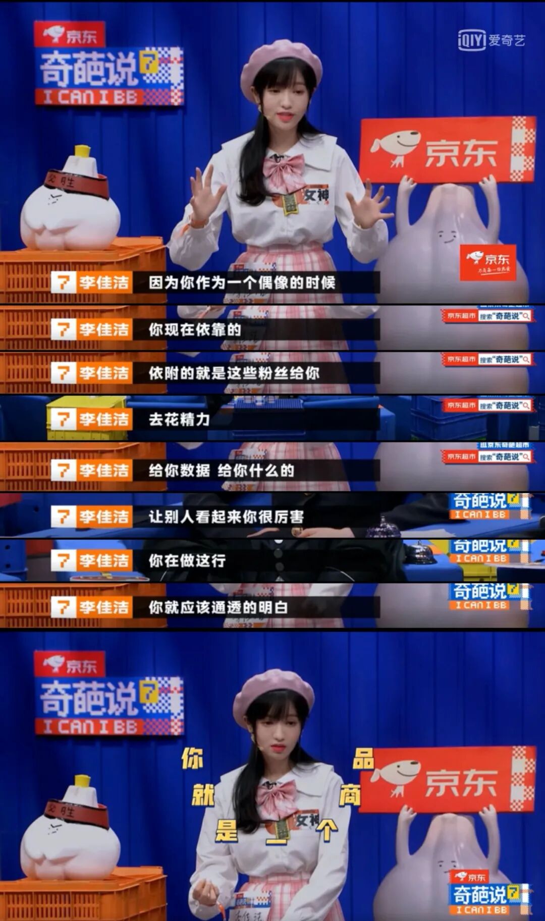 活在花絮里的相亲达人tangoz,和黄执中对打的aka陈近南,海选一轮游的oner岳岳,因为马赛克上热搜的前快男张金条……▼▼▼但以偶像身份站得最牢,镜头最多的是创一轮游,刘雨昕、孔雪儿前队友,虞书欣同公司师妹,自称“选秀地板砖”的李佳洁▼▼▼上一次打48线小艺人、不知名女团成员旗号来参加《奇葩说》的还是马剑越,这次她也来了。生了孩子,变成母婴博主,更成熟更能说的她出场即淘汰,正片镜头都没给几个▼▼▼2020塌房这么多次,是个营销号都明白的陈词滥调还用得着浪费六分钟表演一场噘嘴式哭泣吗?▼▼▼当杨幂问出“人性要服从商品化吗”时,她接不住这份深刻。于是,嘟两秒嘴,转转眼珠,就差手指在太阳穴旁边比个一休哥割地割地的动作了——全程无输出,发言无逻辑,五个导师却怒夸:“很真实”、“活得很明白”、“想法很透彻”结果,拿下五个“喜番”全票晋级