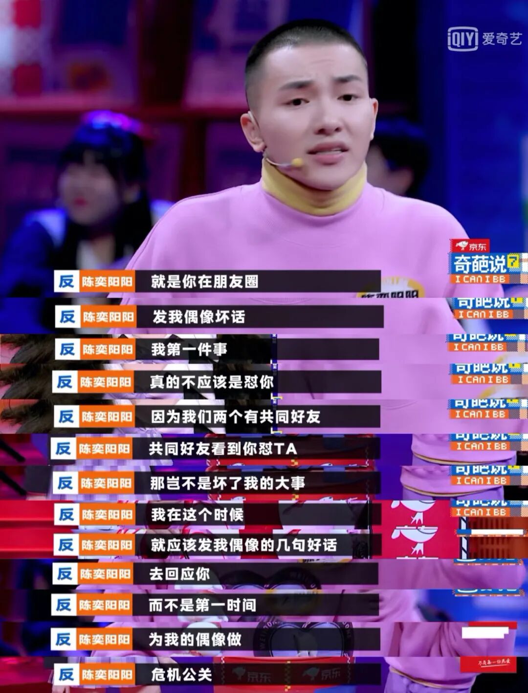 ▼▼▼海选之后,她和抖音网红陈奕阳打的1V1淘汰赛,又挺进了24强▼▼▼选的辩题是:好朋友明知我偶像是谁,还在朋友圈骂TA,我该怼么。就这,提前带好稿的李佳洁,讲的还是偶像照亮饭圈女孩老一套,各家反黑站说的都比这个好千倍▼▼▼辩论中途,一会儿怪观众打乱了思路,现场拿起稿子边看边说(?)▼▼▼低配版的东施效(肖)颦(骁),全程都在挤眉弄眼,阴阳怪气,配上浮夸的肢体动作▼▼▼“让我好好想了想,他吃醋了,这个信号,有点微妙。”尬到圆场王马东都只能苦笑:阳阳,你真的是脑洞清奇▼▼▼到了开杠环节,更让我怀疑九年义务教育的阅读理解都白做了