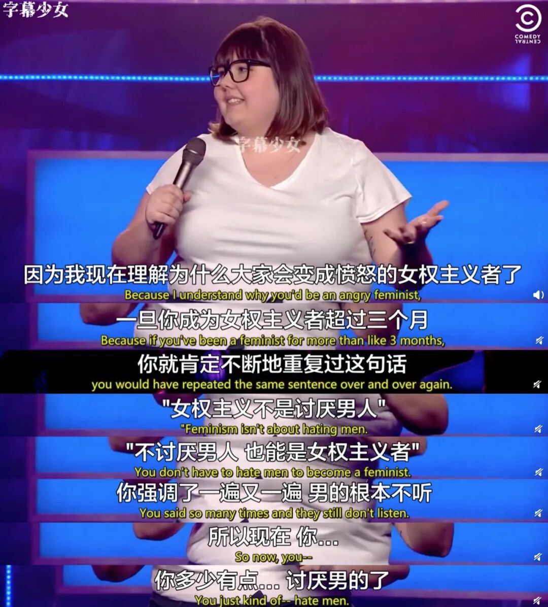 池子说,女性经历了这么多年压迫,太极端的行为和愤怒的表达会消解和平,所以要争取权益,得从法律、立法这些层面上去推进。丹麦喜剧演员Sofie Hagen说,女性的愤怒不还都是被这群不依不饶、不停重复的人逼出来的吗?▼▼▼著名女脱口秀演员Margarent Choho也反驳过:恰恰是回避愤怒本身,制造了更多愤怒。如果压抑某些事情,它们会以一种更为激烈的方式回来▼▼▼![]()