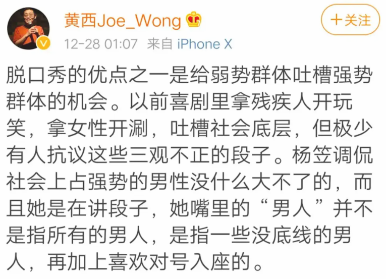 我都22岁零6天了,杨笠那场沉浸互动式脱口秀竟然还在持续,从2020跨到2021,10天的战线,快比顶楼都要drama了。一句“男人,还有底线呢”,再度引发部分网友的怒火▼▼▼意外的是,前同事池子跳出来喊话“脱口秀不是那样”▼▼▼如果说,这时我还因为有滤镜自我宽慰:嗯,罗老师的确脱口秀,杨笠更多体现了现场效果,不同表演方式啪啦啪啦。
