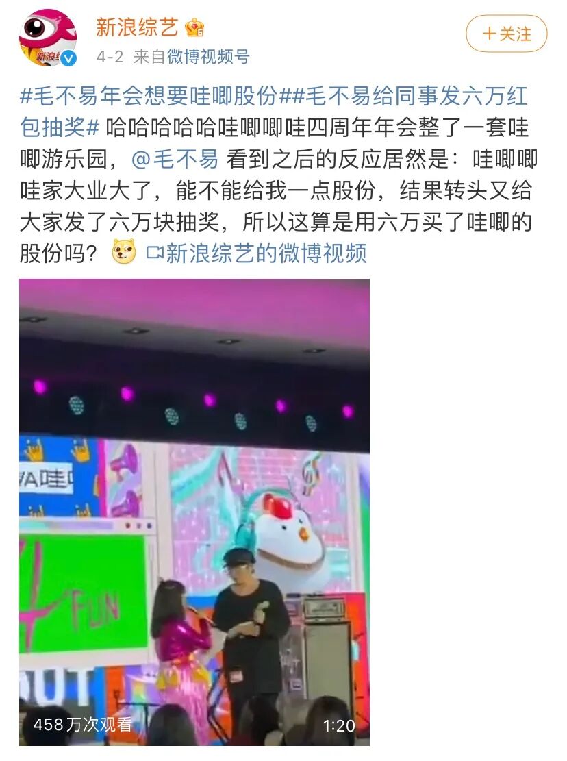 也就是这期大本营播出的前一天,4月2日,哇唧唧哇四周年年会,又一年没中奖的毛毛,还掏出了六万块给同事发红包哈哈哈▼▼▼