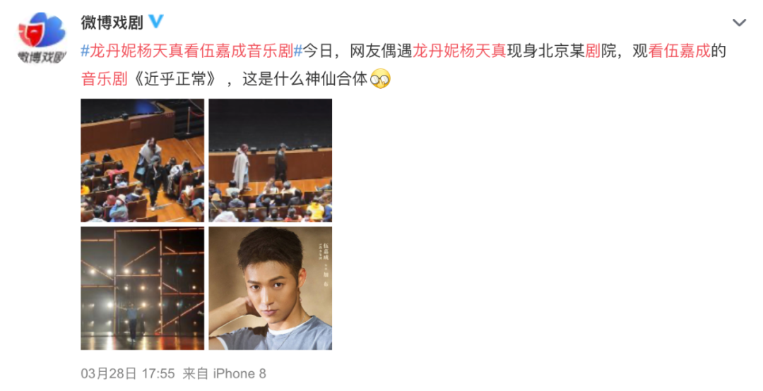 X玖少年团伍嘉成音乐剧《近乎正常》开演,不仅能在观众席里发现带着好友杨天真前来督阵的老板龙丹妮▼▼▼