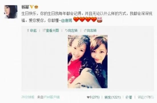 之后每年唐嫣生日,杨幂都发微博为她庆生▼▼▼
