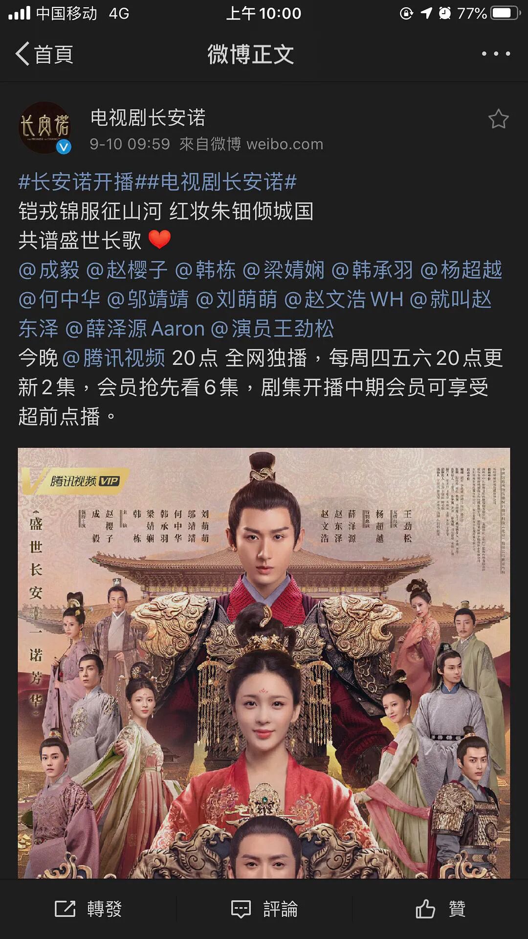隔壁腾讯就特地在9:59分发布《长安诺》的宣传博▼▼▼