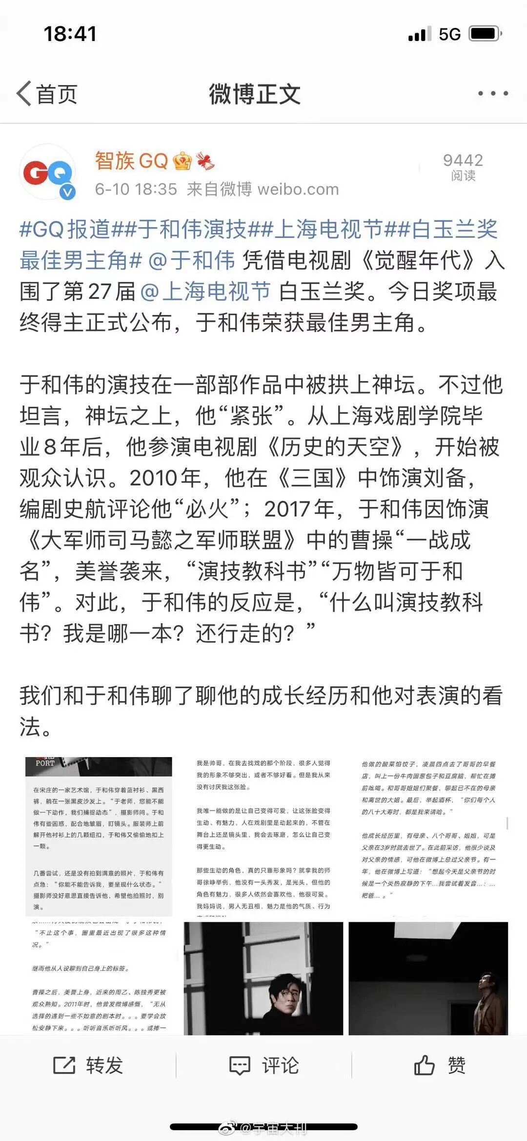 早在18点35分,我还在啃包子,GQ就发微博恭喜于和伟了▼▼▼