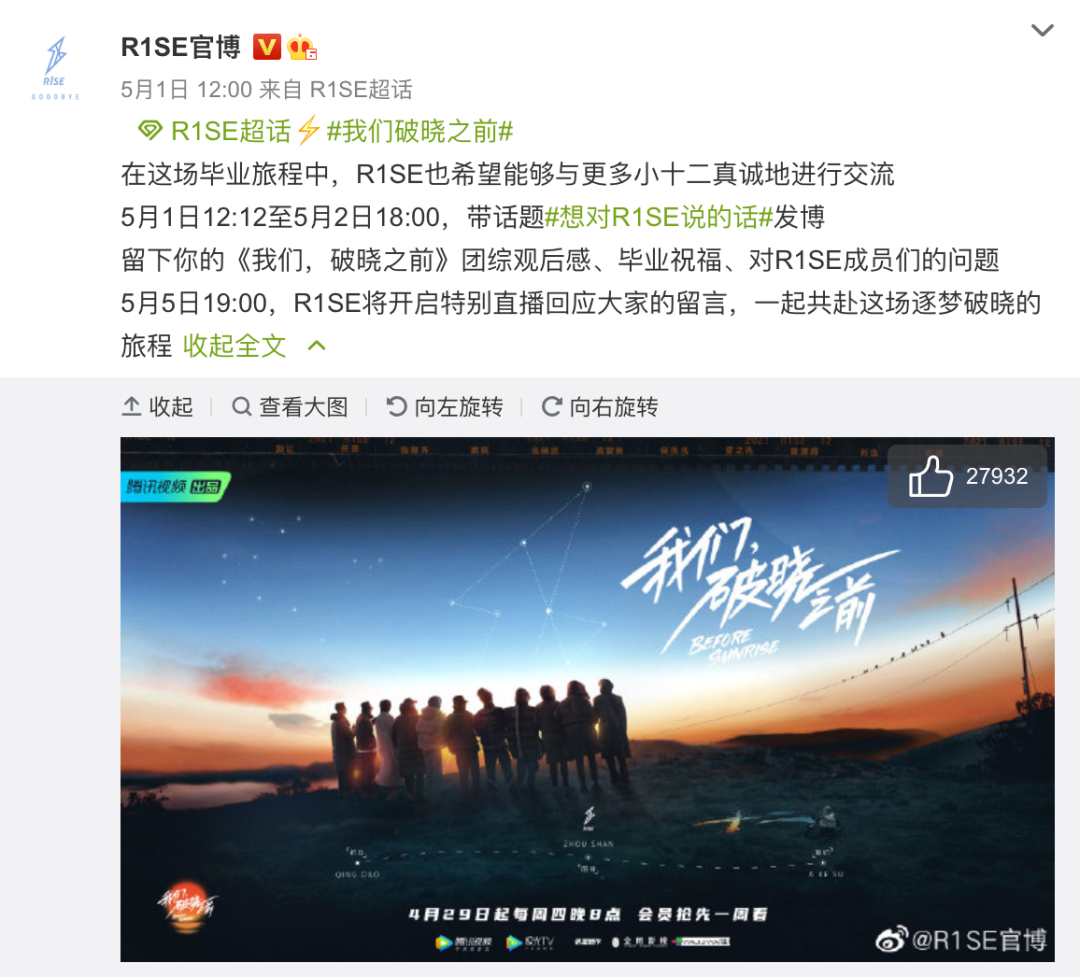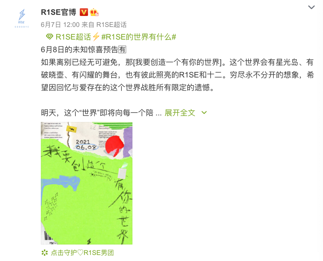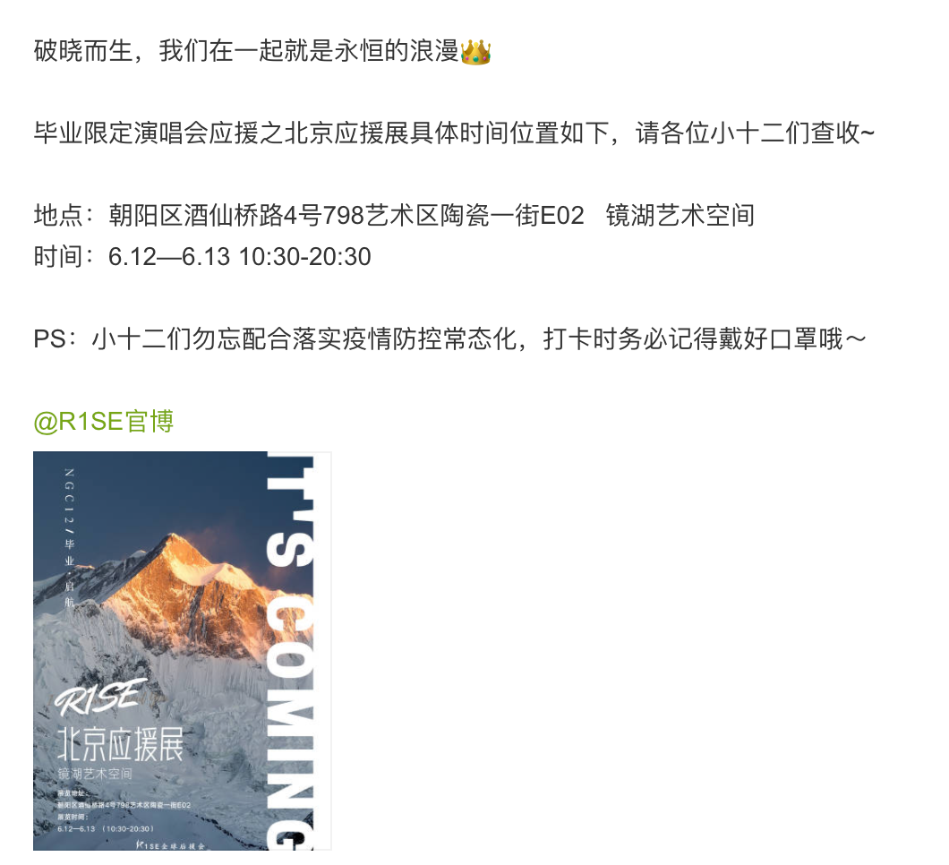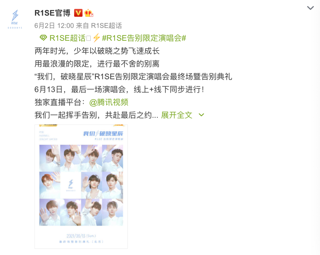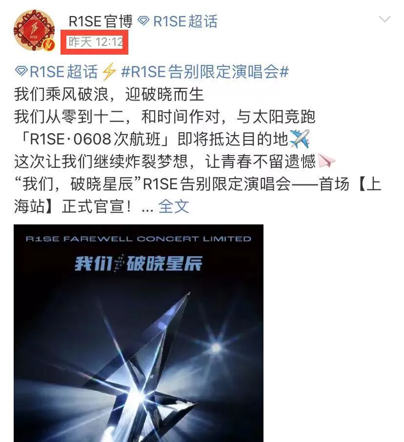 他们要离开的倒数第12天的12:00,随着最后一场告别限定演唱会最终场暨告别典礼官宣,R1SE告别▼▼▼