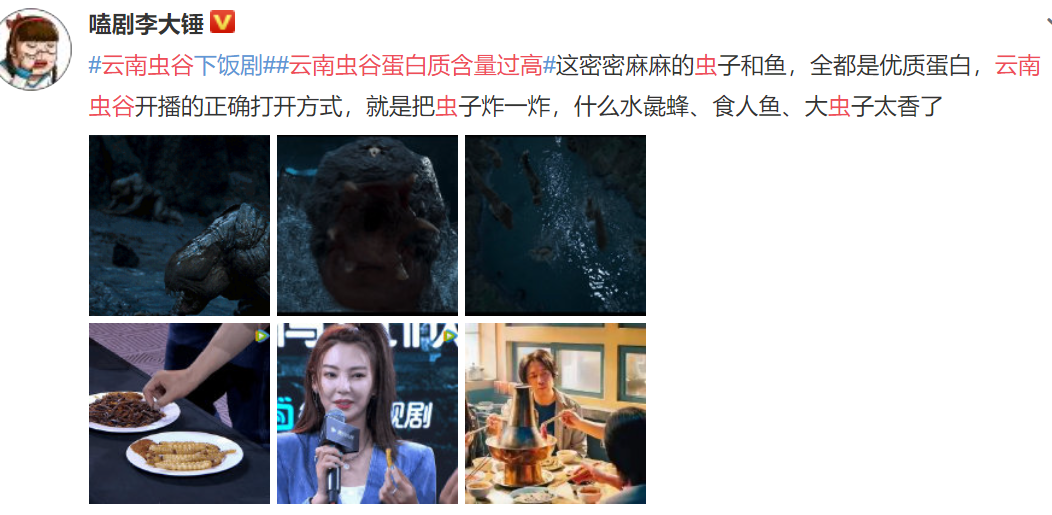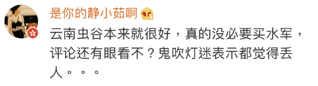 不说搞那些乱七八糟的有的没的,本来剧里的小bug,反而被狂吹放大之后有了逆反作用▼▼▼也真的大可不必买这么多水军,连原有的剧迷都要被劝退▼▼▼现在在微博,几乎看不到什么批评的声音,都被漫天的yxh和水军淹没了,好像就是捂住耳朵不让你听见那些不好的声音。而因为题材的关系,只要稍微说到剧情不好、特效粗糙,就是【为了过审没办法】【经费有限】▼▼▼甚至#云南虫谷里的下蛊是真的吗#上了热搜,剧粉都会担心被封▼▼▼这是因为《云南虫谷》自去年5月杀青后,在观众的翘首盼望中一直铺垫着这种担心审查不过的心情,骚操作不断。![]()