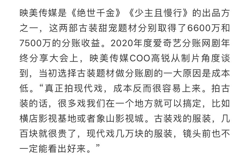像以上提到的这些剧,大多都是投资方和播出平台的分账剧。