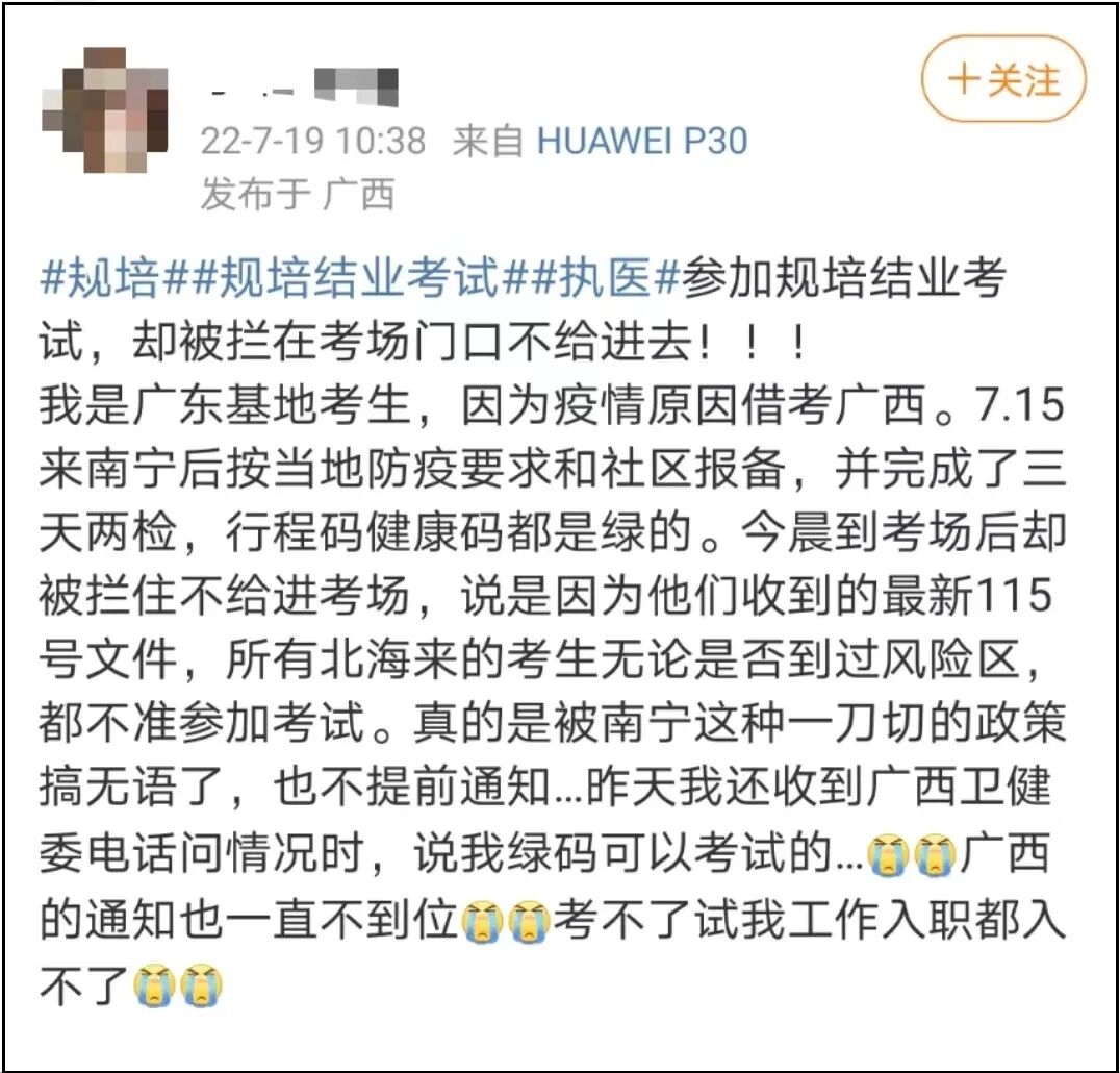 考试结束当日,有考生发微博称:规培结业考试不让进入考场,无法参加考试。