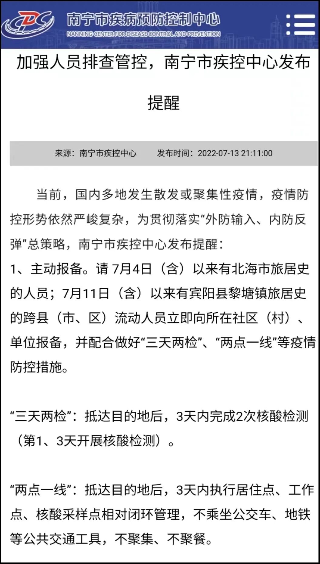据查询,7月13日,南宁市疾控中心发布的防疫政策是要求“北海旅居史人员主动报备,‘三天两检’。”