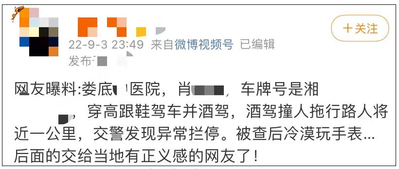 9月3日晚上,小编在某短视频平台刷到这个新闻时,在评论区就有网友爆料这位宝马女司机是娄底某医院的一名医生,甚至在当晚直接“人肉”出名字——肖某某,这与官方第二天凌晨发的“警情通报”中的肖某某是吻合的。
