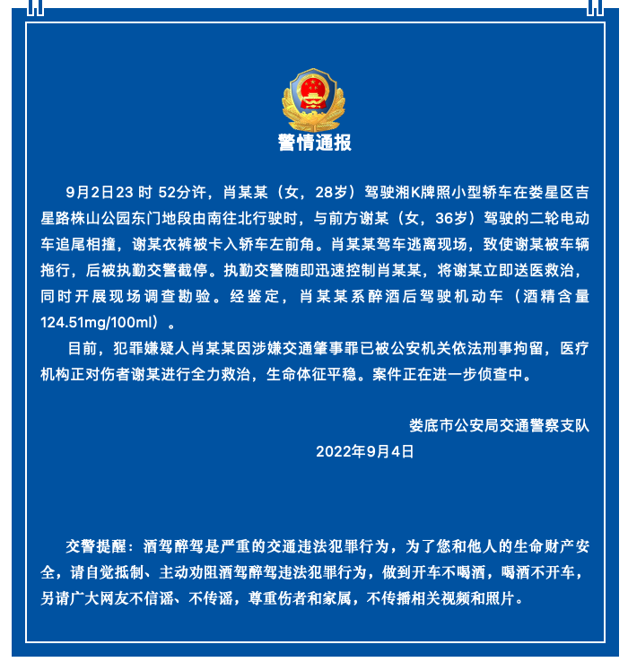 9月4日,娄底交警支队就此事发布《警情通报》: